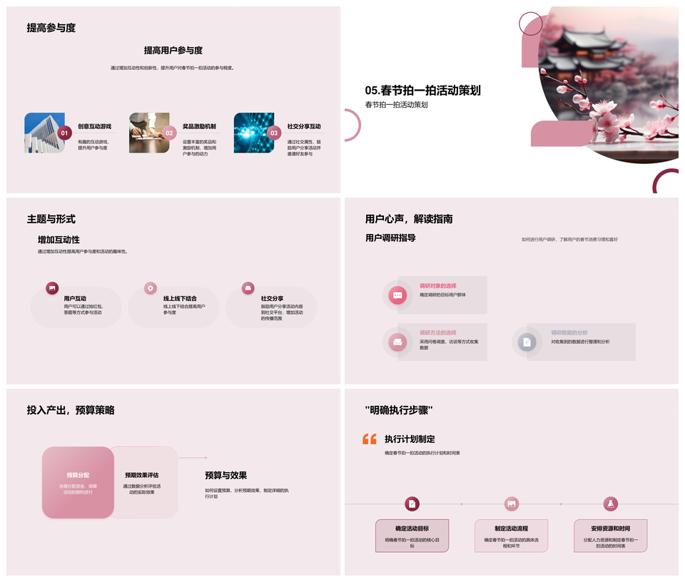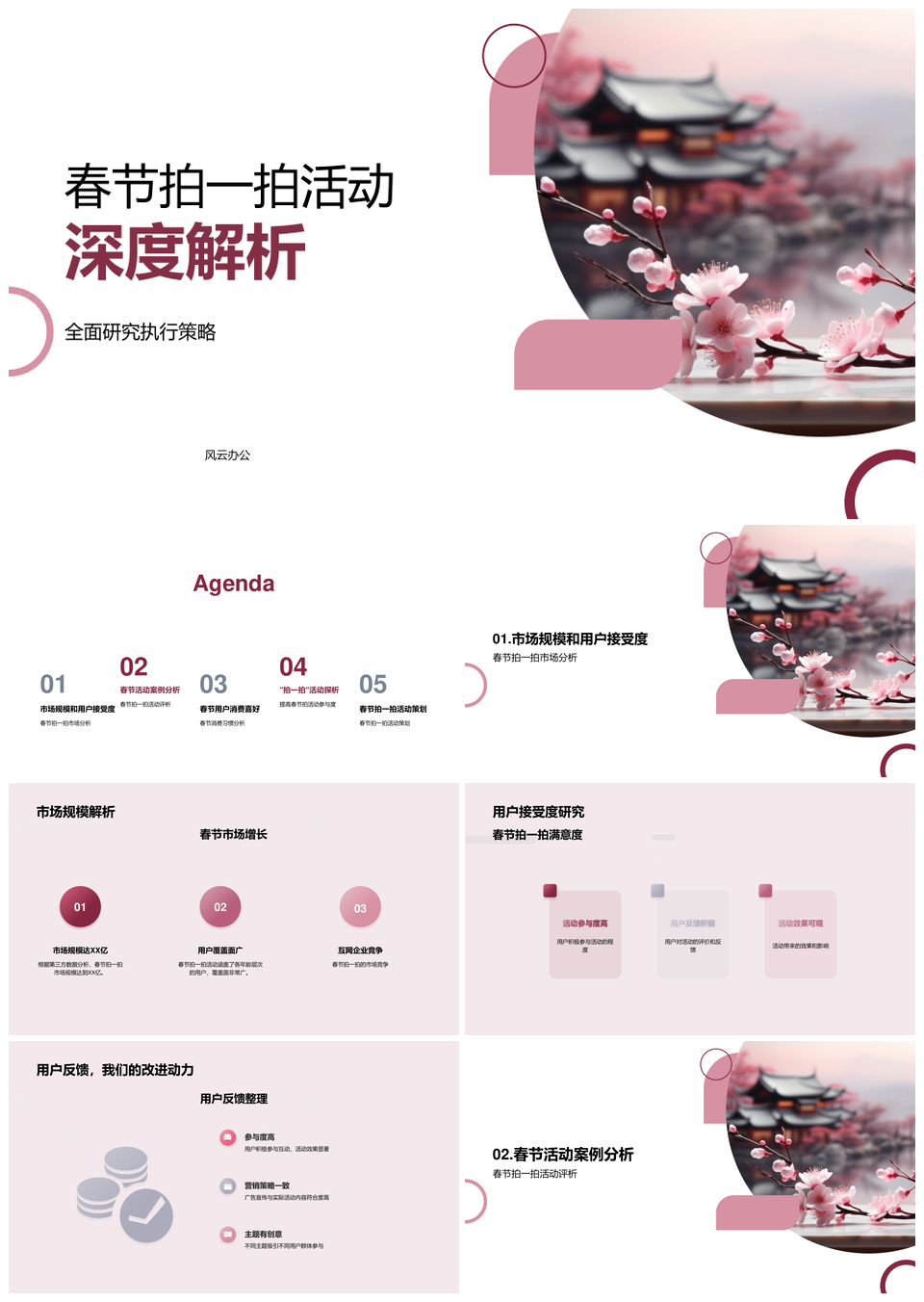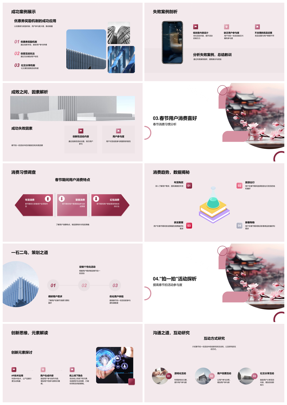 这是一张春节拍一拍活动市场用户消费习惯创新互动分析PPT模板,包含春节、拍一拍活动、市场、用户、消费习惯、创新、互动分析等主题内容,也可用作春节拍一拍活动市场、拍一拍活动市场用户、活动市场用户消费习惯、市场用户消费习惯创新、用户消费习惯创新互动、消费习惯创新互动分析、春节拍一拍活动、拍一拍活动市场、活动市场用户、市场用户消费习惯、用户消费习惯创新、消费习惯创新互动、创新互动分析、春节拍一拍、拍一拍活动等PPT场景使用。 风云办公提供的春节拍一拍活动市场用户消费习惯创新互动分析PPT模板,下载格式为pptx,一共24页,作品中文字及图均可以修改和编辑,图片更改请在作品中右键图片并更换,文字修改请直接点击文字进行修改。