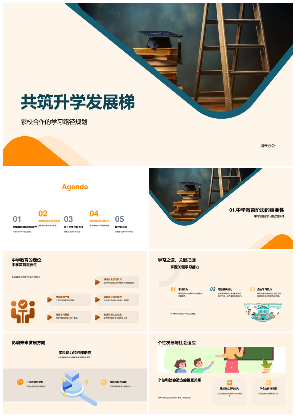 风云办公提供的家校共筑升学梯规划路径登顶毕业帽PPT模板,下载格式为pptx,一共33页,作品中文字及图均可以修改和编辑,图片更改请在作品中右键图片并更换,文字修改请直接点击文字进行修改。