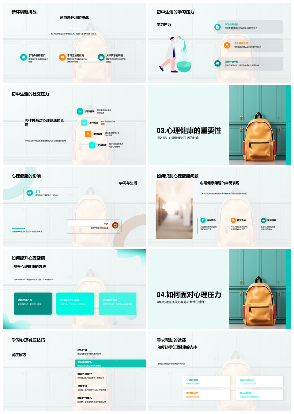风云办公提供的初中新生心理适应挑战与减压技巧PPT模板,下载格式为pptx,一共23页,作品中文字及图均可以修改和编辑,图片更改请在作品中右键图片并更换,文字修改请直接点击文字进行修改。
