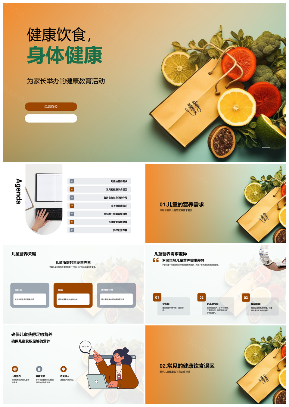 风云办公提供的家长儿童健康饮食营养专家指导教育PPT模板,下载格式为pptx,一共31页,作品中文字及图均可以修改和编辑,图片更改请在作品中右键图片并更换,文字修改请直接点击文字进行修改。