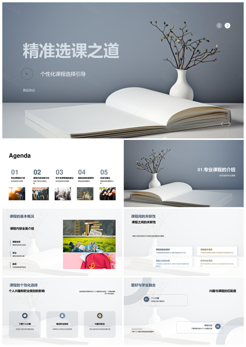 这是一张精准选课指南专业兴趣职业规划课程书籍PPT模板,包含精准、选课指南、专业、兴趣、职业规划、课程、书籍等主题内容,也可用作精准选课指南专业、选课指南专业兴趣、指南专业兴趣职业规划、专业兴趣职业规划课程、兴趣职业规划课程书籍、精准选课指南、选课指南专业、指南专业兴趣、专业兴趣职业规划、兴趣职业规划课程、职业规划课程书籍、精准选课、选课指南、指南专业、专业兴趣等PPT场景使用。 风云办公提供的精准选课指南专业兴趣职业规划课程书籍PPT模板,下载格式为pptx,一共33页,作品中文字及图均可以修改和编辑,图片更改请在作品中右键图片并更换,文字修改请直接点击文字进行修改。
