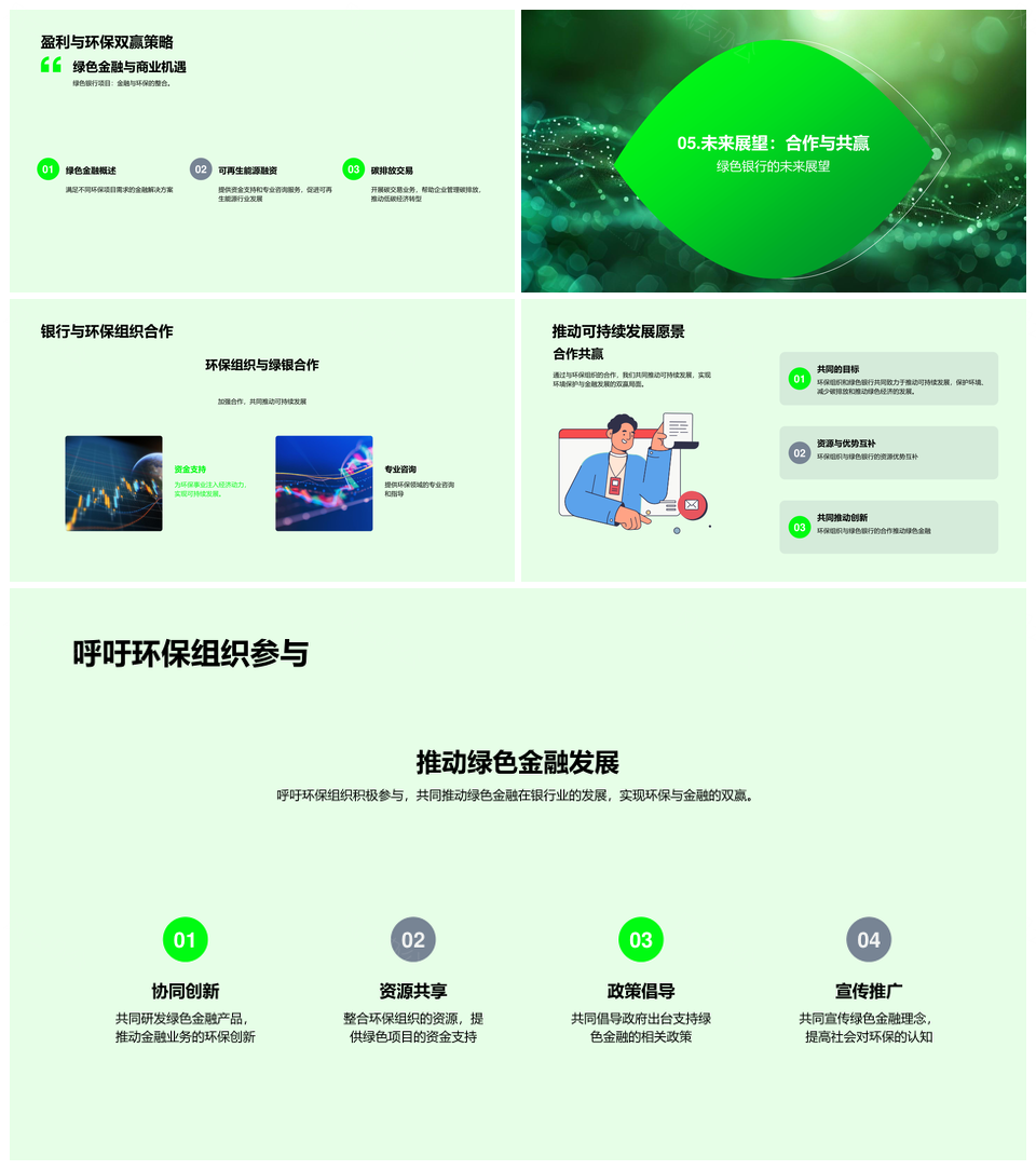 这是一张绿色银行创业路演金融服务环保产品计划书PPT模板,包含绿色银行、创业路演、金融服务、环保产品、计划书等主题内容,也可用作绿色银行创业路演、创业路演金融服务环保、金融服务环保产品计划书、绿色银行创业路演金融、银行创业路演金融服务、路演金融服务环保产品、创业路演金融环保产品、绿色金融服务环保产品、环保产品计划书绿色、绿色银行创业路演服务、金融服务环保产品绿色、绿色银行创业金融服务、银行金融环保产品计划书、环保产品绿色银行创业、创业路演金融环保计划等PPT场景使用。 风云办公提供的绿色银行创业路演金融服务环保产品计划书PPT模板,下载格式为pptx,一共23页,作品中文字及图均可以修改和编辑,图片更改请在作品中右键图片并更换,文字修改请直接点击文字进行修改。