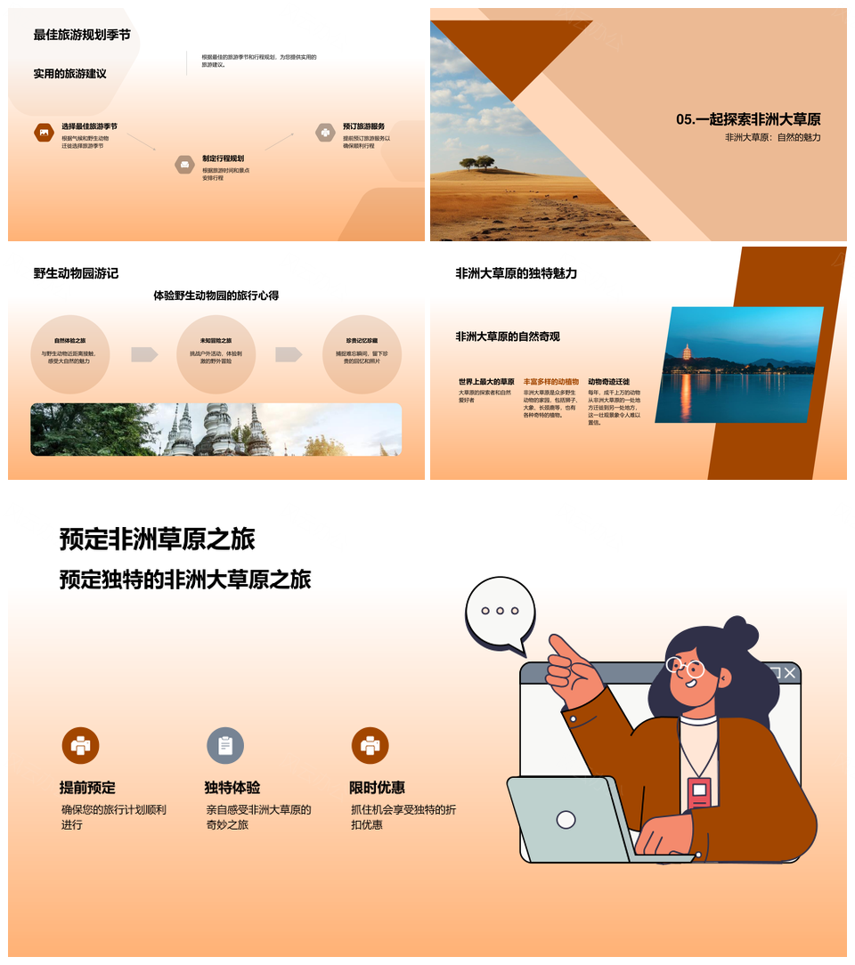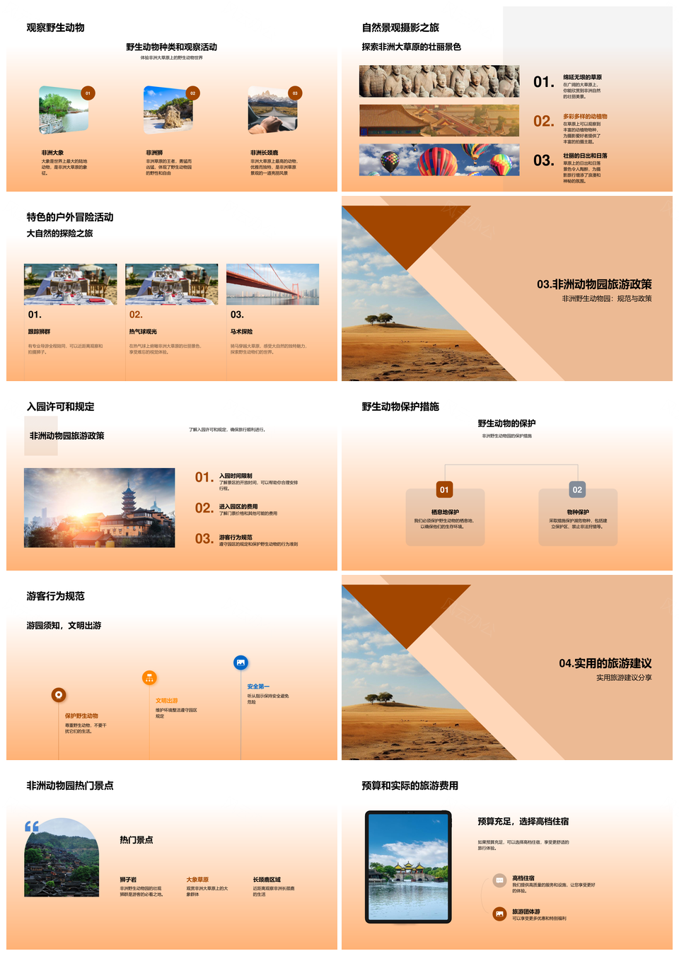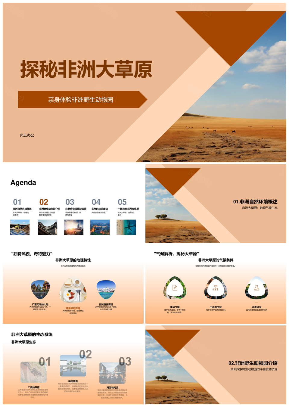 风云办公提供的非洲大草原地理气候生态野生动物探秘PPT模板,下载格式为pptx,一共23页,作品中文字及图均可以修改和编辑,图片更改请在作品中右键图片并更换,文字修改请直接点击文字进行修改。