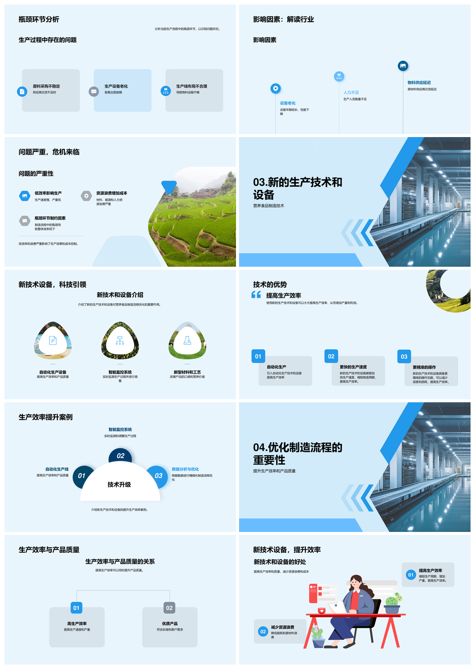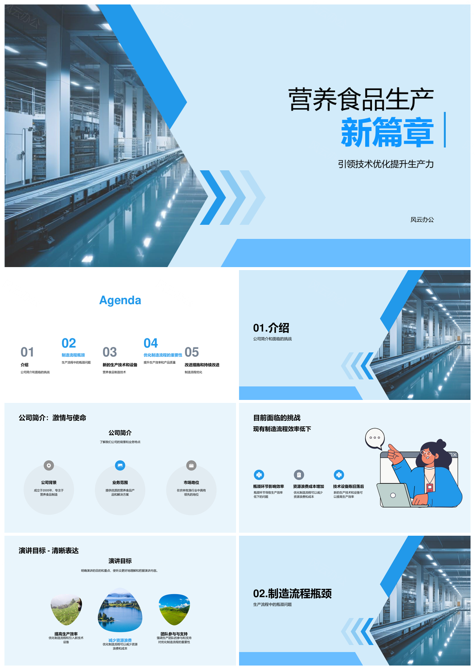 风云办公提供的营养食品生产技术升级破瓶颈提效减耗PPT模板,下载格式为pptx,一共25页,作品中文字及图均可以修改和编辑,图片更改请在作品中右键图片并更换,文字修改请直接点击文字进行修改。