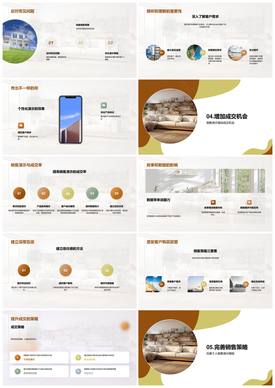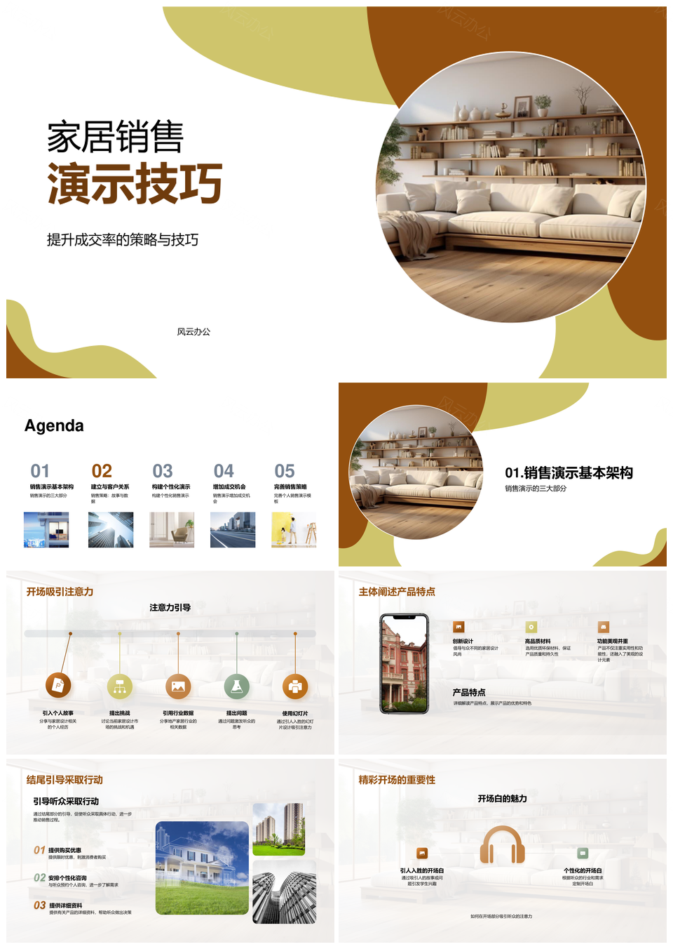风云办公提供的家居销售策略演示技巧提升成交率PPT模板,下载格式为pptx,一共33页,作品中文字及图均可以修改和编辑,图片更改请在作品中右键图片并更换,文字修改请直接点击文字进行修改。