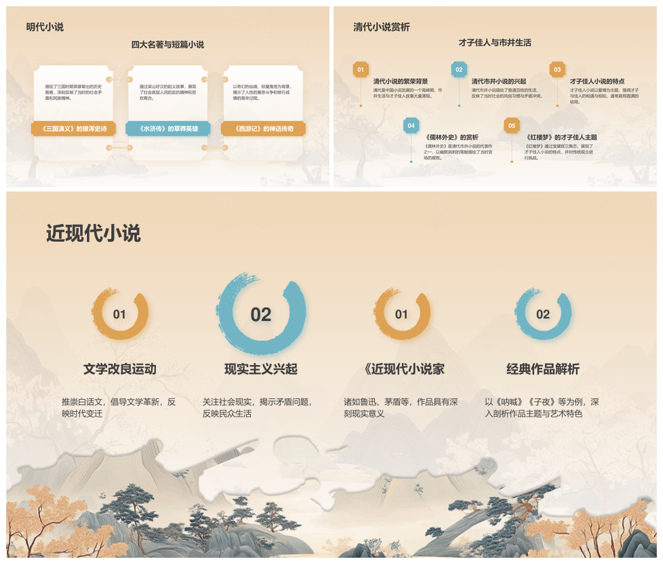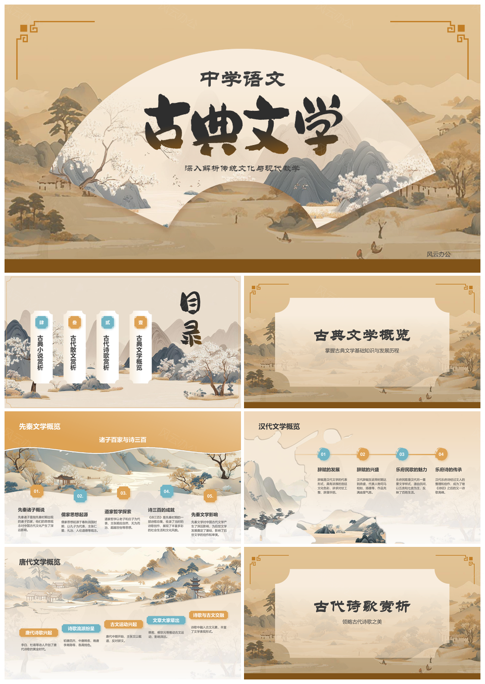 风云办公提供的古典文学经典赏析传承价值文化底蕴PPT模板,下载格式为pptx,一共21页,作品中文字及图均可以修改和编辑,图片更改请在作品中右键图片并更换,文字修改请直接点击文字进行修改。