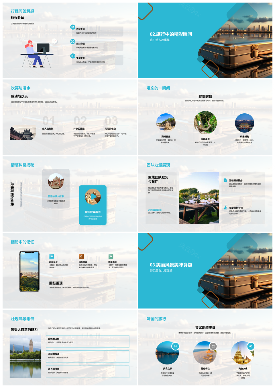 旅行顾问定制摄影美食线路客户故事手提箱PPT模板推荐