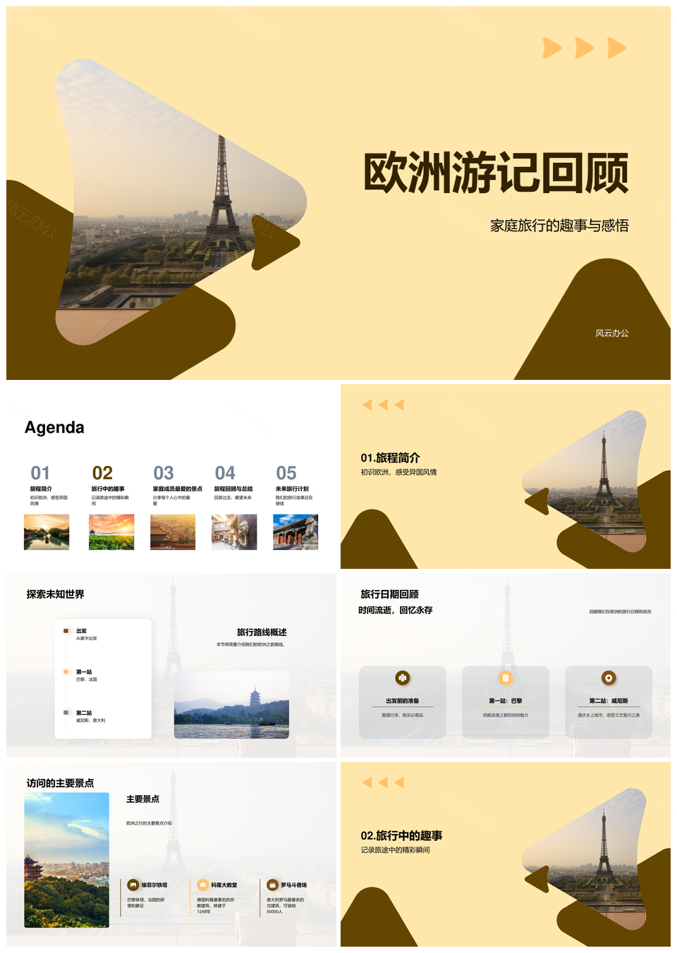 风云办公提供的家庭欧洲游文化历史美食埃菲尔铁塔记PPT模板,下载格式为pptx,一共23页,作品中文字及图均可以修改和编辑,图片更改请在作品中右键图片并更换,文字修改请直接点击文字进行修改。
