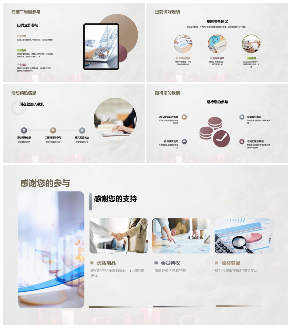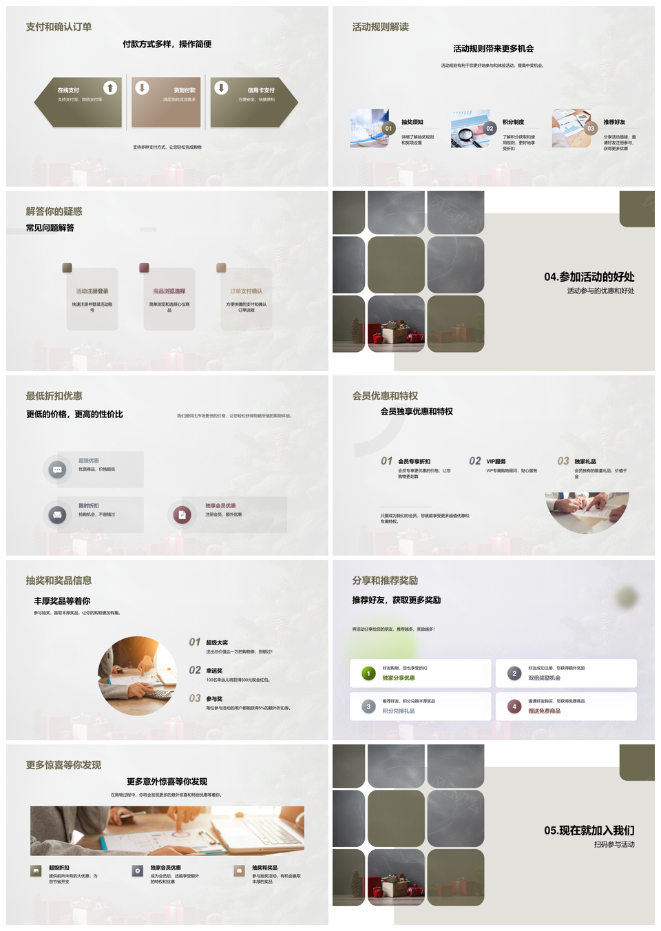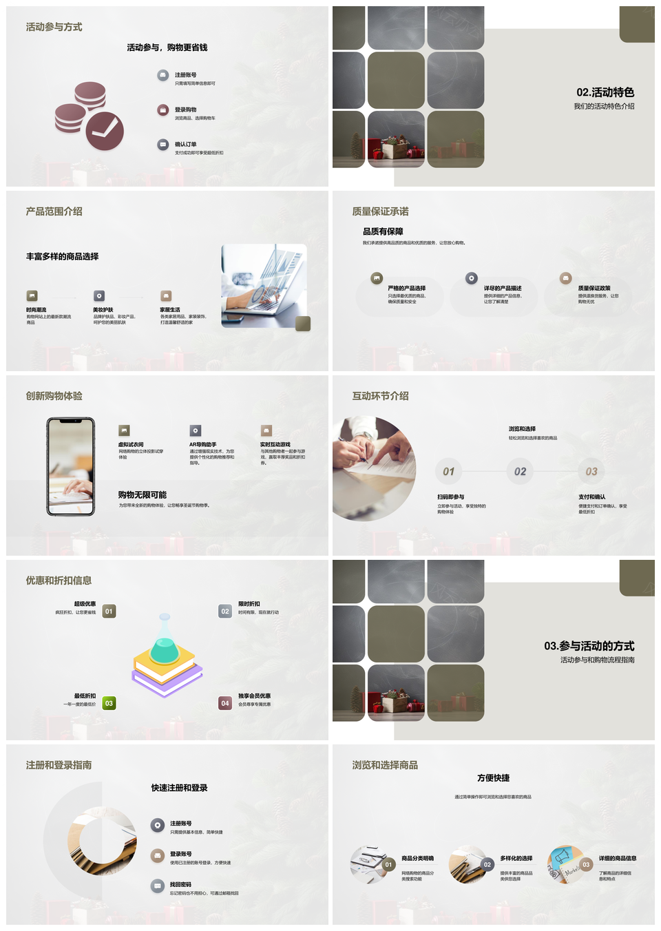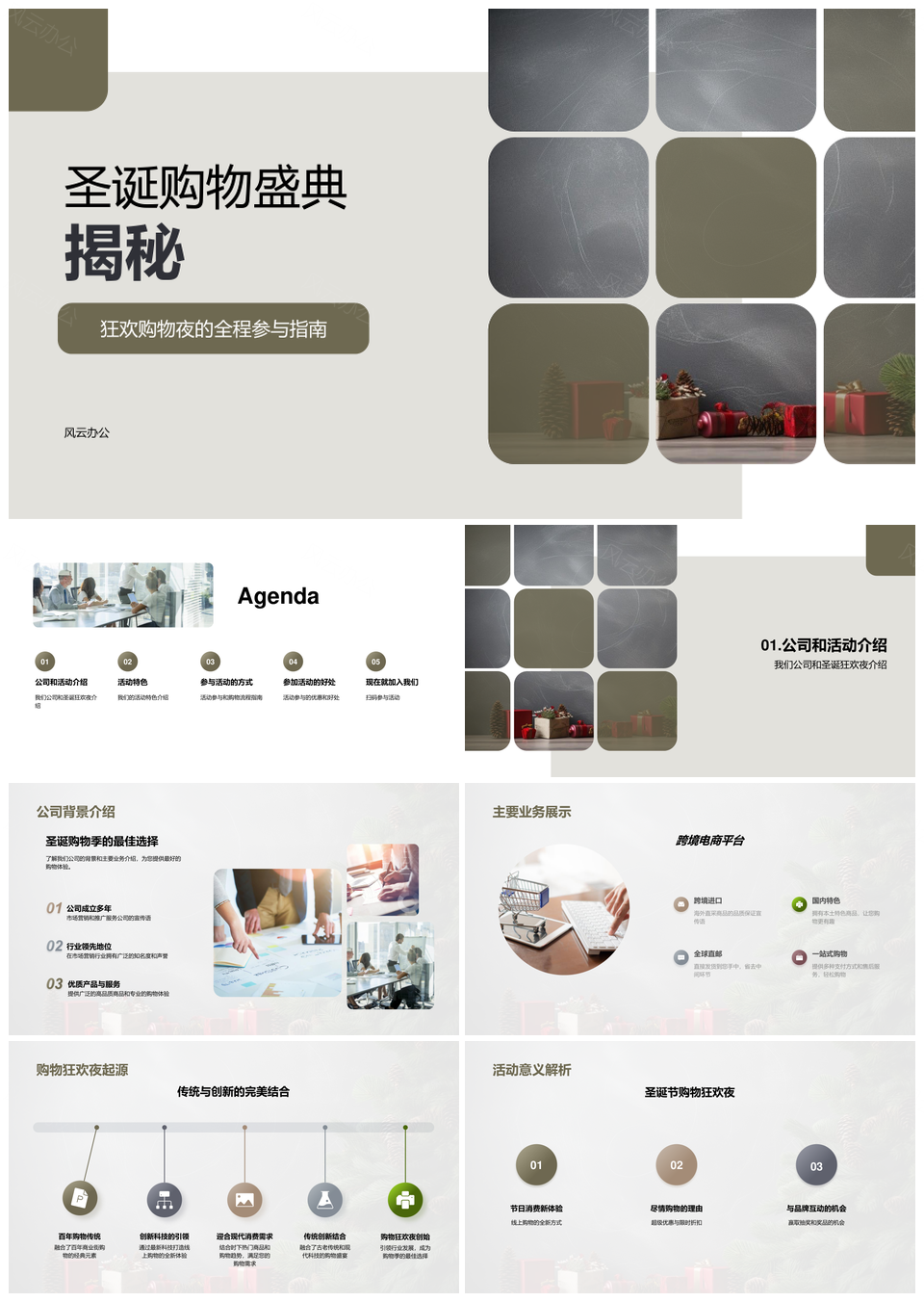 这是一张圣诞购物盛典狂欢夜公司业务产品优惠体验揭秘PPT模板,包含圣诞、购物、盛典、狂欢夜、公司、业务、产品、优惠、体验、揭秘等主题内容,也可用作圣诞购物盛典狂欢夜、公司业务产品优惠、业务产品优惠体验、产品优惠体验揭秘、圣诞购物狂欢夜、购物盛典狂欢夜、狂欢夜公司业务、公司业务产品、业务产品优惠、产品优惠体验、优惠体验揭秘、圣诞购物盛典、圣诞购物、购物盛典、盛典狂欢夜等PPT场景使用。 风云办公提供的圣诞购物盛典狂欢夜公司业务产品优惠体验揭秘PPT模板,下载格式为pptx,一共33页,作品中文字及图均可以修改和编辑,图片更改请在作品中右键图片并更换,文字修改请直接点击文字进行修改。