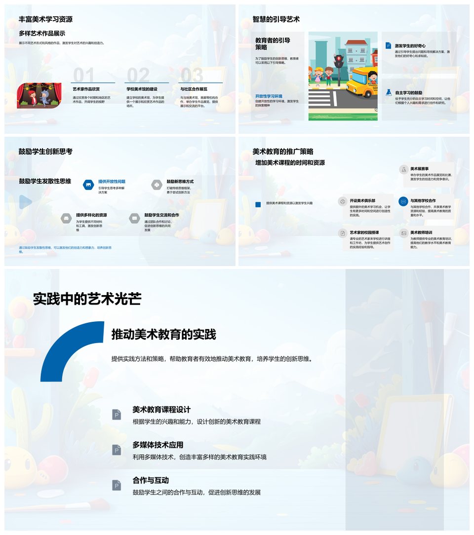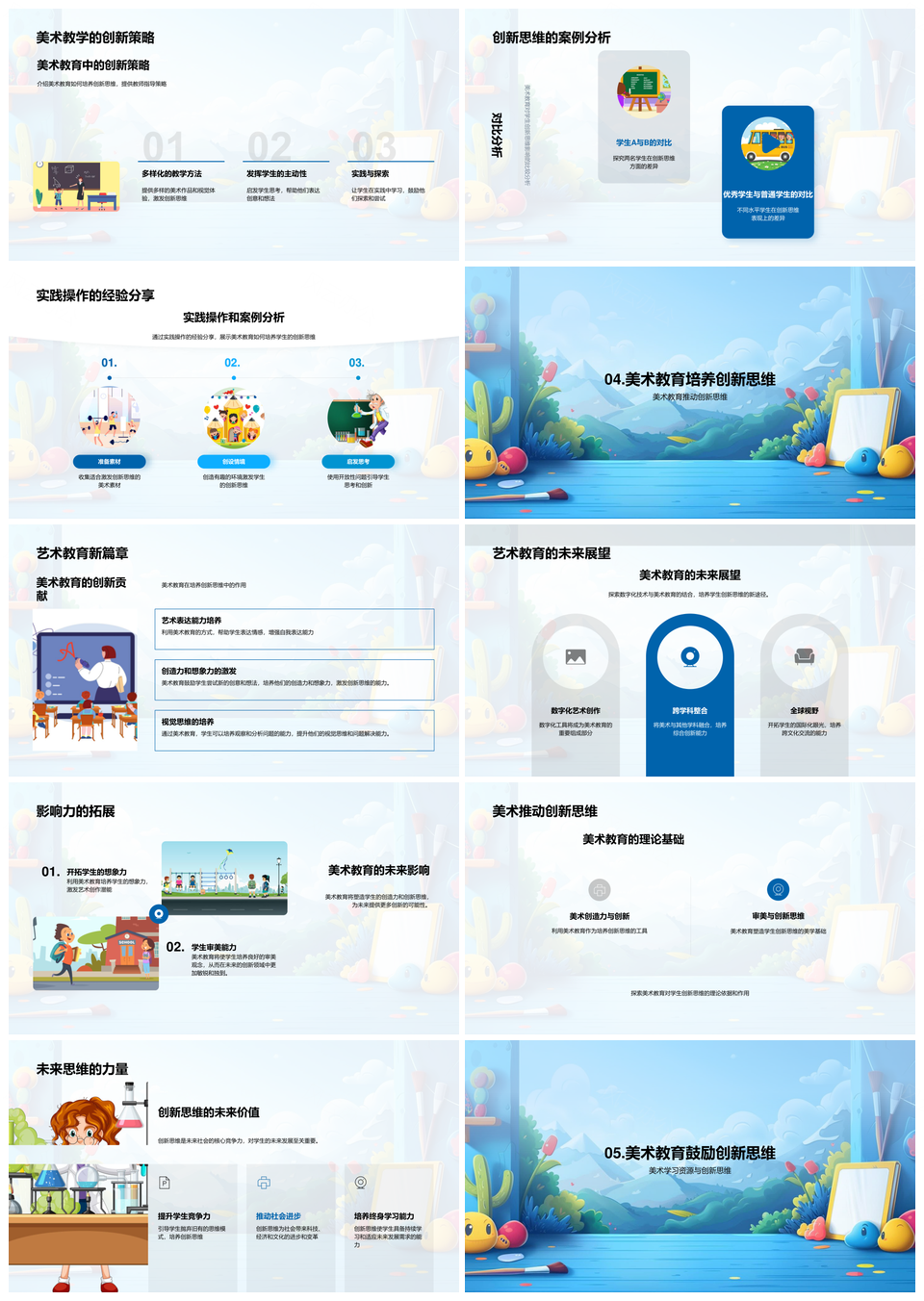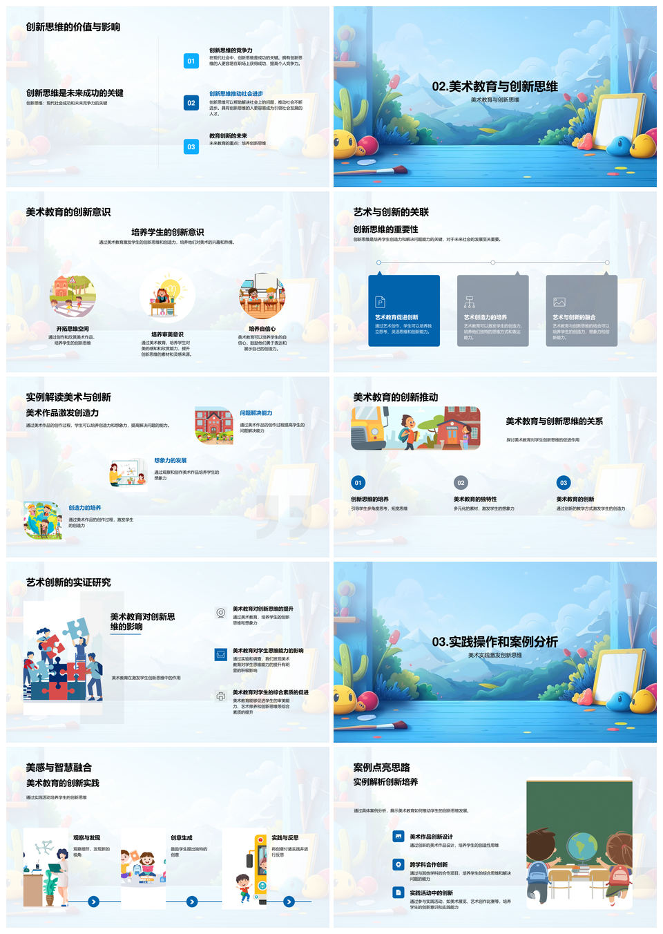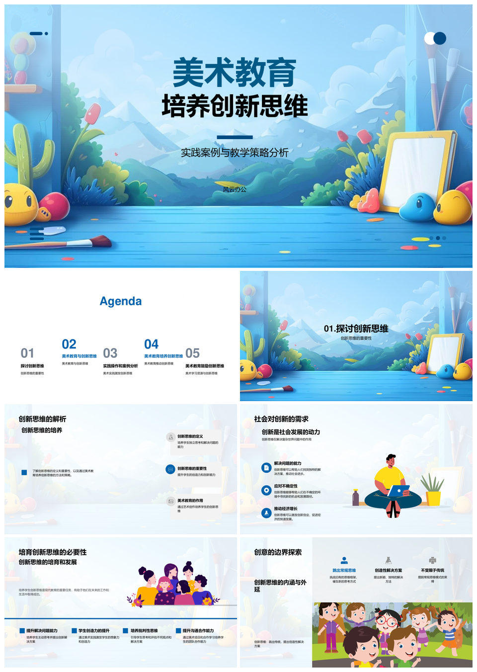 风云办公提供的美术教育创新思维培养策略实践案例PPT模板,下载格式为pptx,一共33页,作品中文字及图均可以修改和编辑,图片更改请在作品中右键图片并更换,文字修改请直接点击文字进行修改。