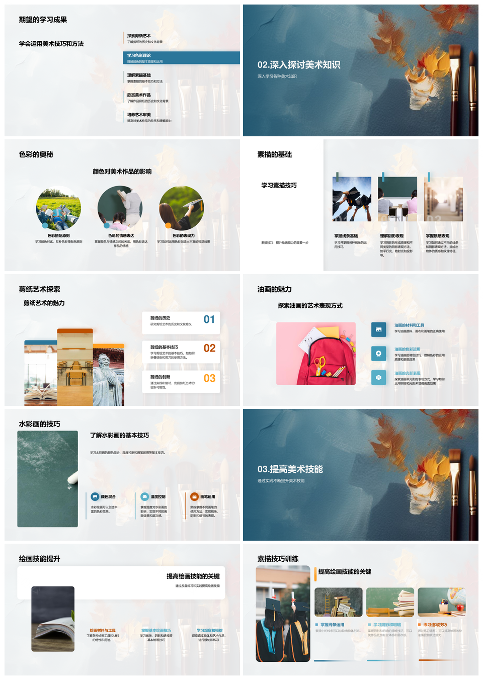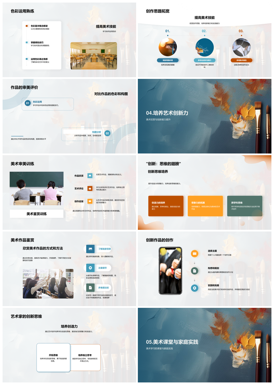 这是一张四年级美术课堂培养审美创新能力色彩素描剪纸PPT模板,包含四年级、美术课堂、培养、审美、创新能力、色彩、素描、剪纸等主题内容,也可用作四年级美术课堂培养审美、四年级美术课堂创新能力、四年级美术课堂色彩素描、四年级美术课堂剪纸、美术课堂培养创新能力、美术课堂培养色彩素描、美术课堂审美色彩剪纸、培养审美创新能力色彩、培养创新能力色彩素描、创新能力色彩素描剪纸、四年级培养审美创新、美术课堂色彩素描剪纸、审美创新能力素描剪纸、色彩素描剪纸培养、课堂培养创新能力素描等PPT场景使用。 风云办公提供的四年级美术课堂培养审美创新能力色彩素描剪纸PPT模板,下载格式为pptx,一共33页,作品中文字及图均可以修改和编辑,图片更改请在作品中右键图片并更换,文字修改请直接点击文字进行修改。