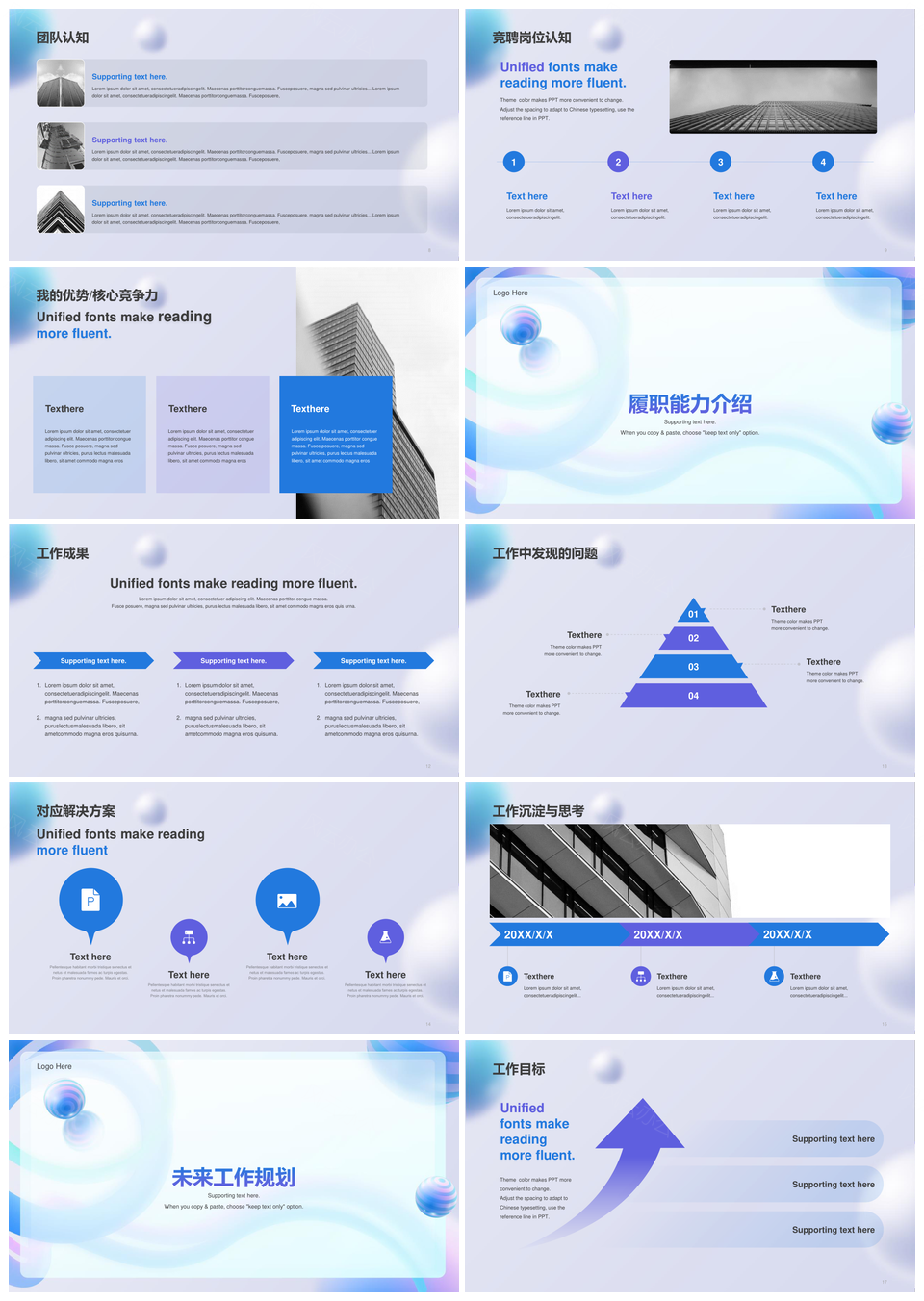 风云办公提供的蓝色创意炫酷毛玻璃几何竞聘述职PPT模板,下载格式为pptx,一共21页,作品中文字及图均可以修改和编辑,图片更改请在作品中右键图片并更换,文字修改请直接点击文字进行修改。