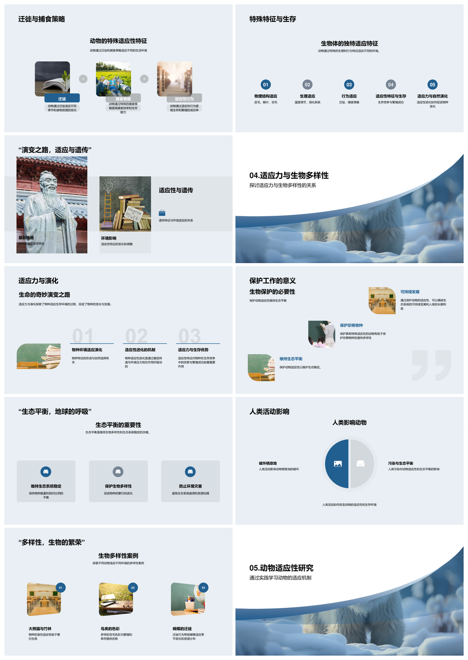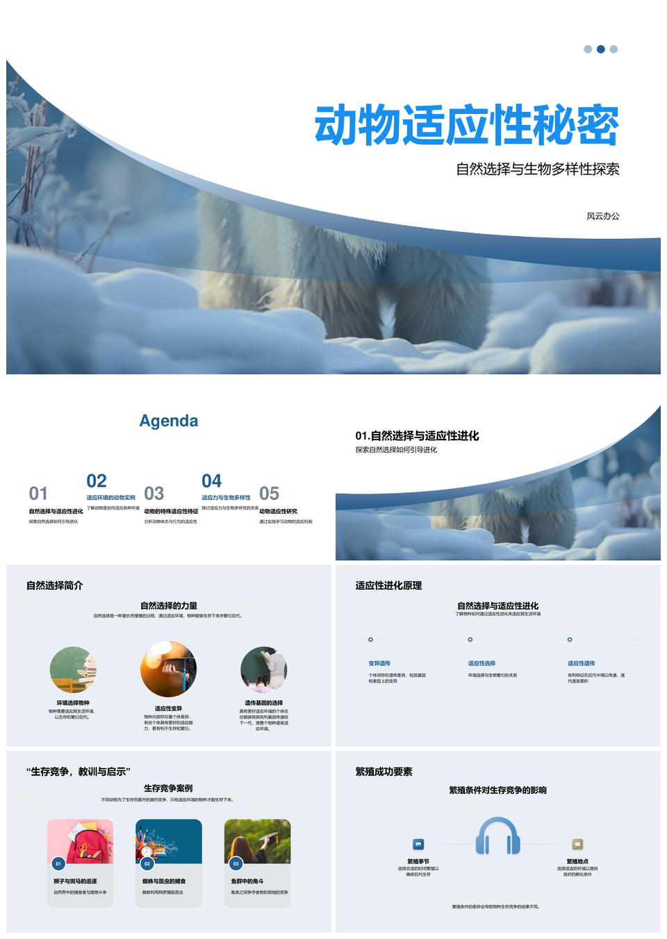 风云办公提供的动物适应性进化自然选择生物多样性PPT模板,下载格式为pptx,一共33页,作品中文字及图均可以修改和编辑,图片更改请在作品中右键图片并更换,文字修改请直接点击文字进行修改。