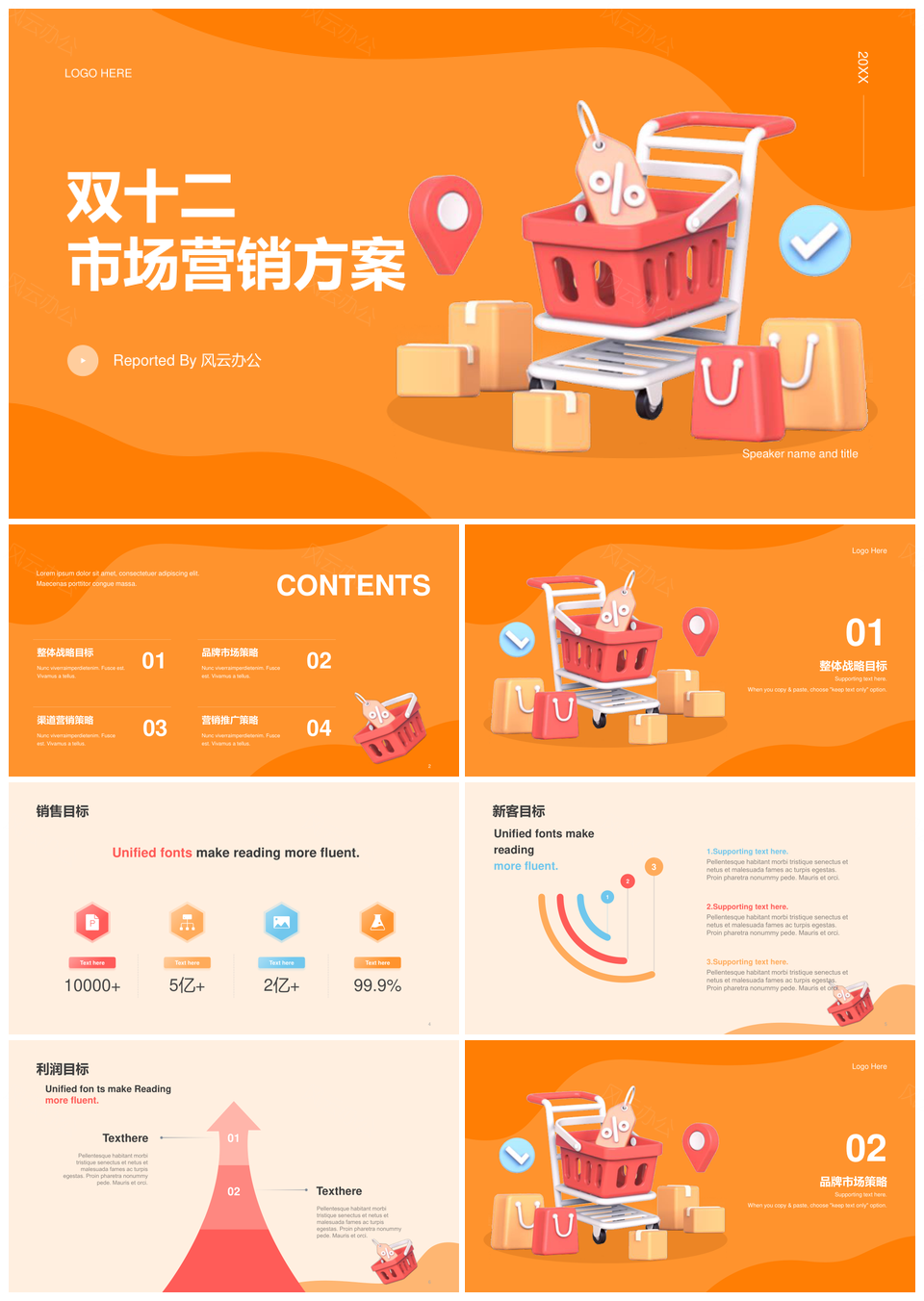 风云办公提供的橙色创意酷炫双十一双十二市场营销PPT模板,下载格式为pptx,一共18页,作品中文字及图均可以修改和编辑,图片更改请在作品中右键图片并更换,文字修改请直接点击文字进行修改。