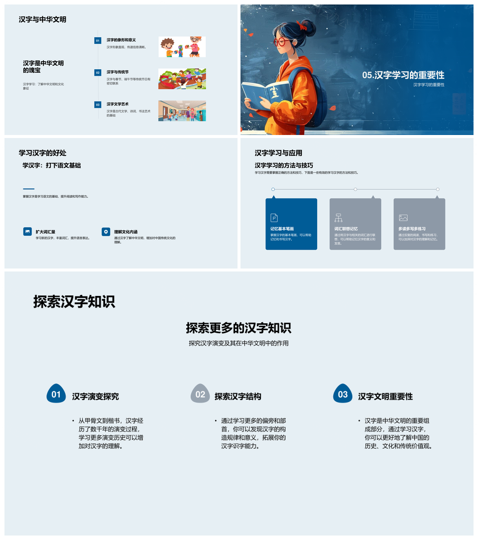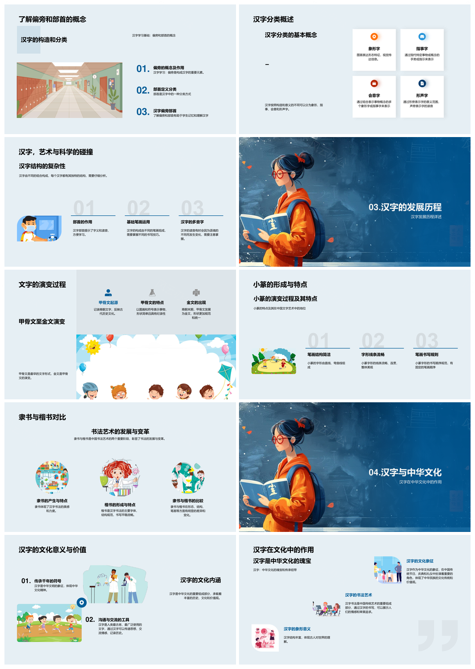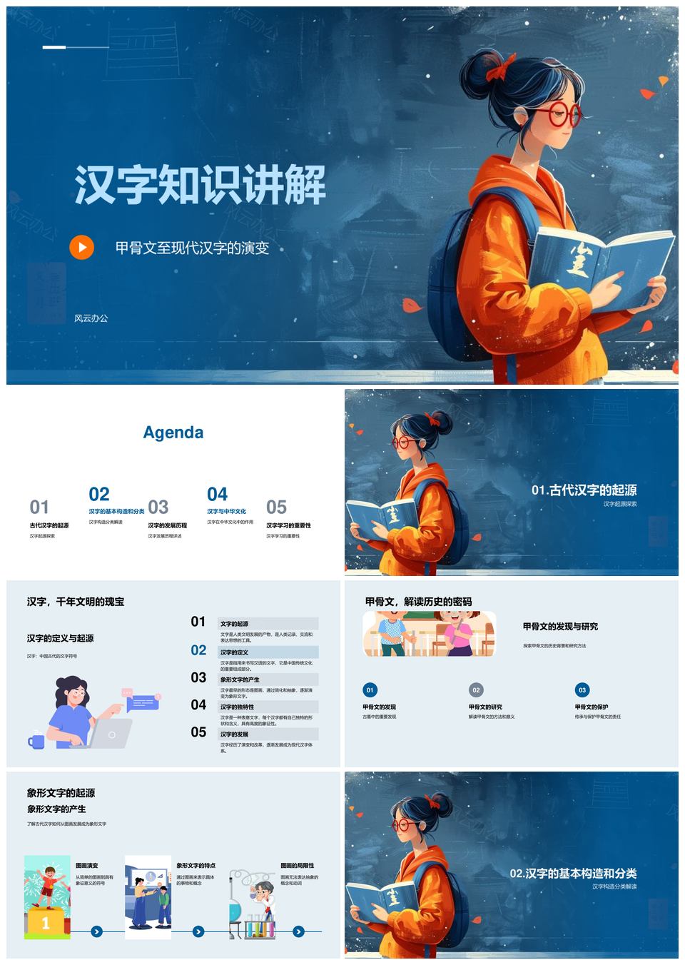 风云办公提供的汉字演变甲骨文象形偏旁部首分类讲解PPT模板,下载格式为pptx,一共23页,作品中文字及图均可以修改和编辑,图片更改请在作品中右键图片并更换,文字修改请直接点击文字进行修改。