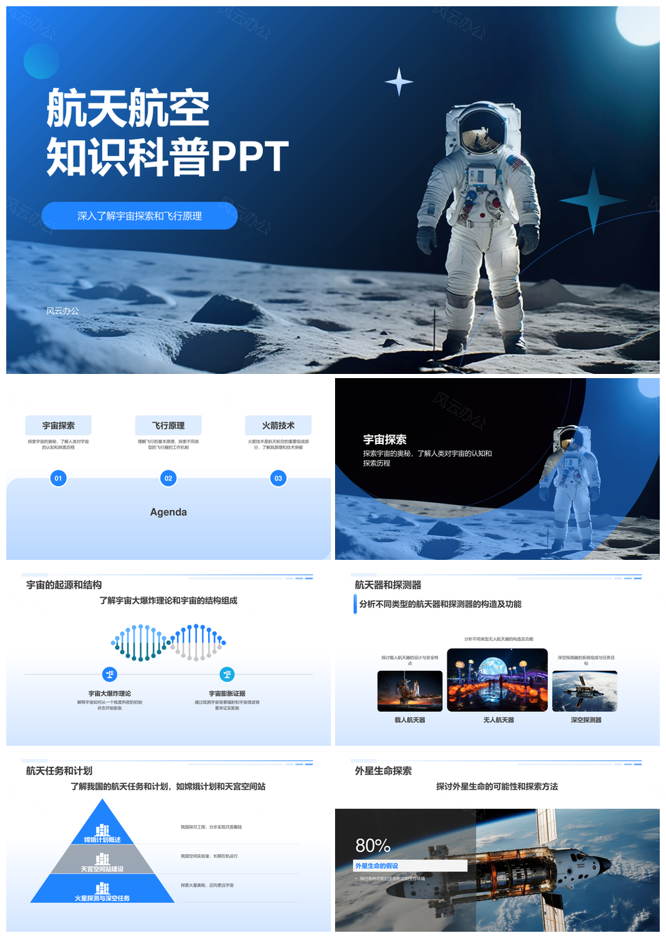 风云办公提供的航天航空技术知识科普与太空探索PPT模板,下载格式为pptx,一共18页,作品中文字及图均可以修改和编辑,图片更改请在作品中右键图片并更换,文字修改请直接点击文字进行修改。