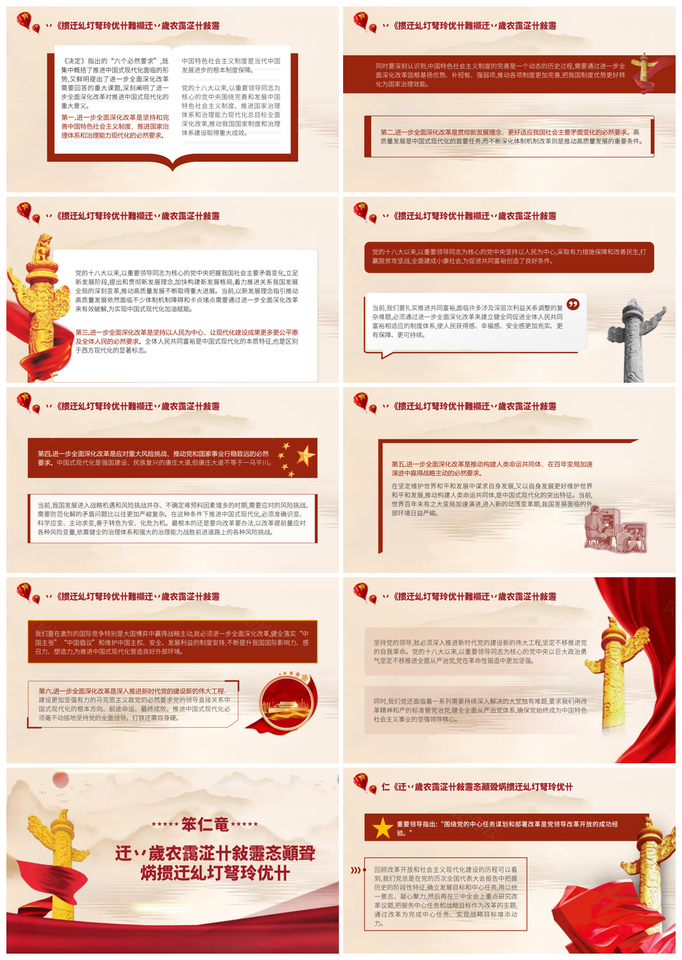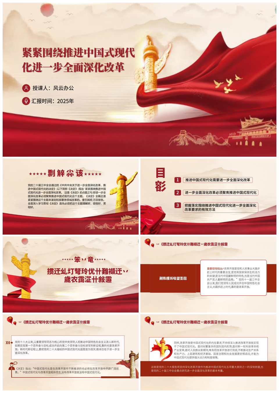 这是一张2025二十届三中全会中国式现代化全面深化改革党课ppt模板,包含二十届三中全会、中国式现代化、全面深化改革、党课等主题内容,也可用作2025二十届三中全会中国式现代化全面深化改革、二十届三中全会中国式现代化全面深化改革党课、中国式现代化全面深化改革党课模板、2025二十届三中全会中国式现代化、二十届三中全会中国式现代化全面深化改革、中国式现代化全面深化改革党课、全面深化改革党课模板、2025二十届三中全会、二十届三中全会中国式现代化、中国式现代化全面深化改革、全面深化改革党课、党课模板、二十届三中全会全面深化改革、中国式现代化党课、全面深化改革模板等PPT场景使用。 风云办公提供的2025二十届三中全会中国式现代化全面深化改革党课ppt模板,下载格式为pptx,一共31页,作品中文字及图均可以修改和编辑,图片更改请在作品中右键图片并更换,文字修改请直接点击文字进行修改。