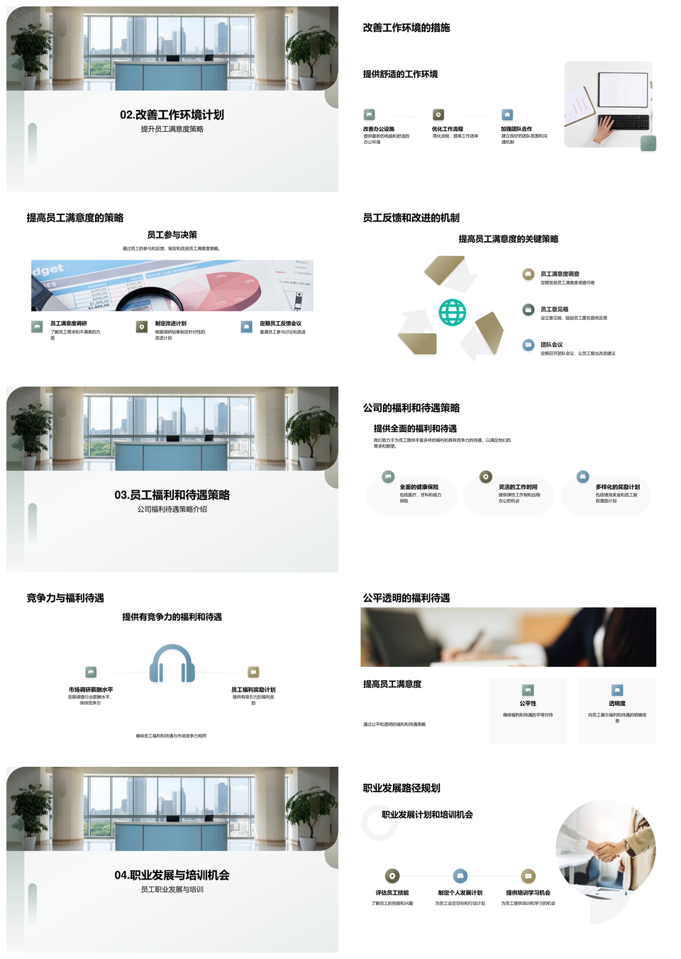 这是一张优化人力提升企业价值与员工满意文化福利环境发展PPT模板,包含优化、人力、提升、企业价值、员工、满意、文化、福利、环境、发展等主题内容,也可用作优化人力提升企业价值、提升企业价值员工满意、企业价值员工满意文化、员工满意文化福利环境、文化福利环境发展优化、优化人力提升价值员工、提升价值员工满意文化、价值员工满意文化福利、员工满意文化福利环境、满意文化福利环境发展、文化福利环境发展人力、福利环境发展优化提升、环境发展优化人力价值、发展优化提升企业满意、企业价值文化福利发展等PPT场景使用。 风云办公提供的优化人力提升企业价值与员工满意文化福利环境发展PPT模板,下载格式为pptx,一共24页,作品中文字及图均可以修改和编辑,图片更改请在作品中右键图片并更换,文字修改请直接点击文字进行修改。