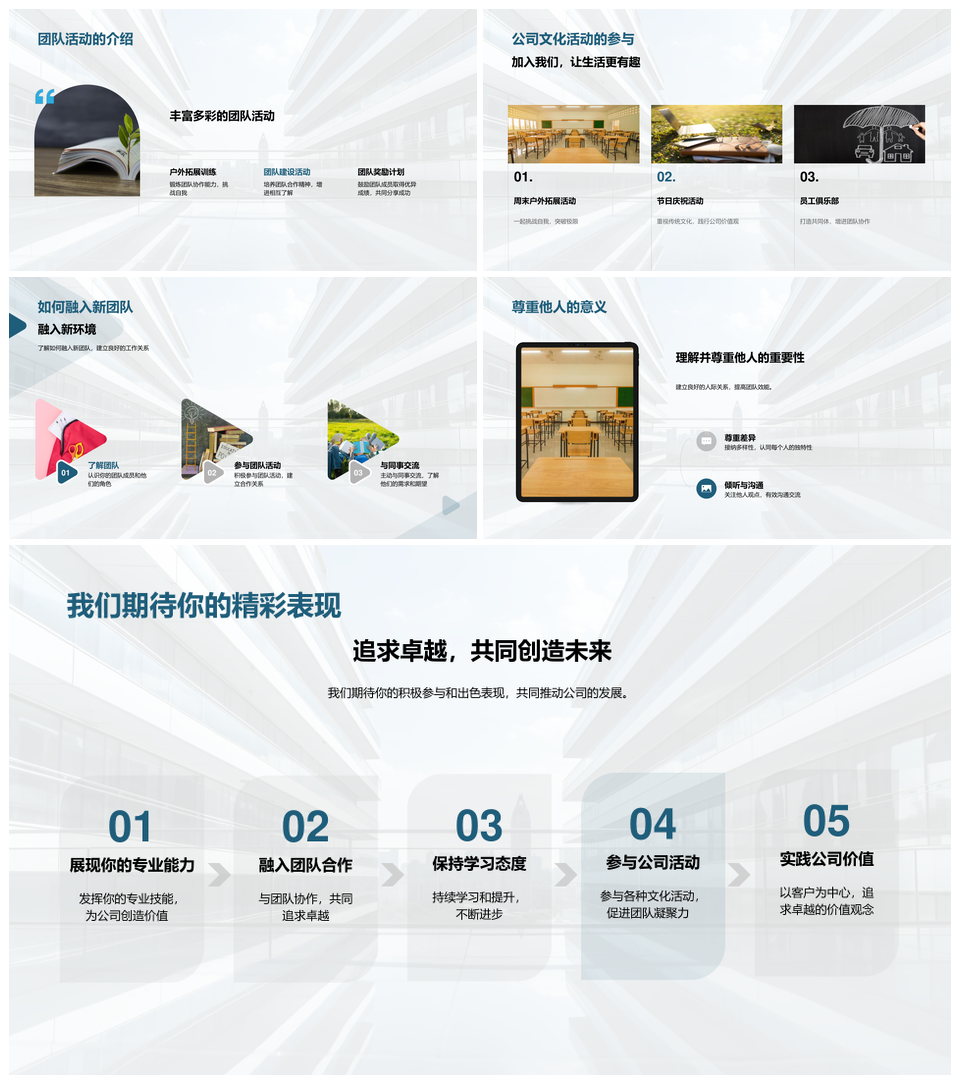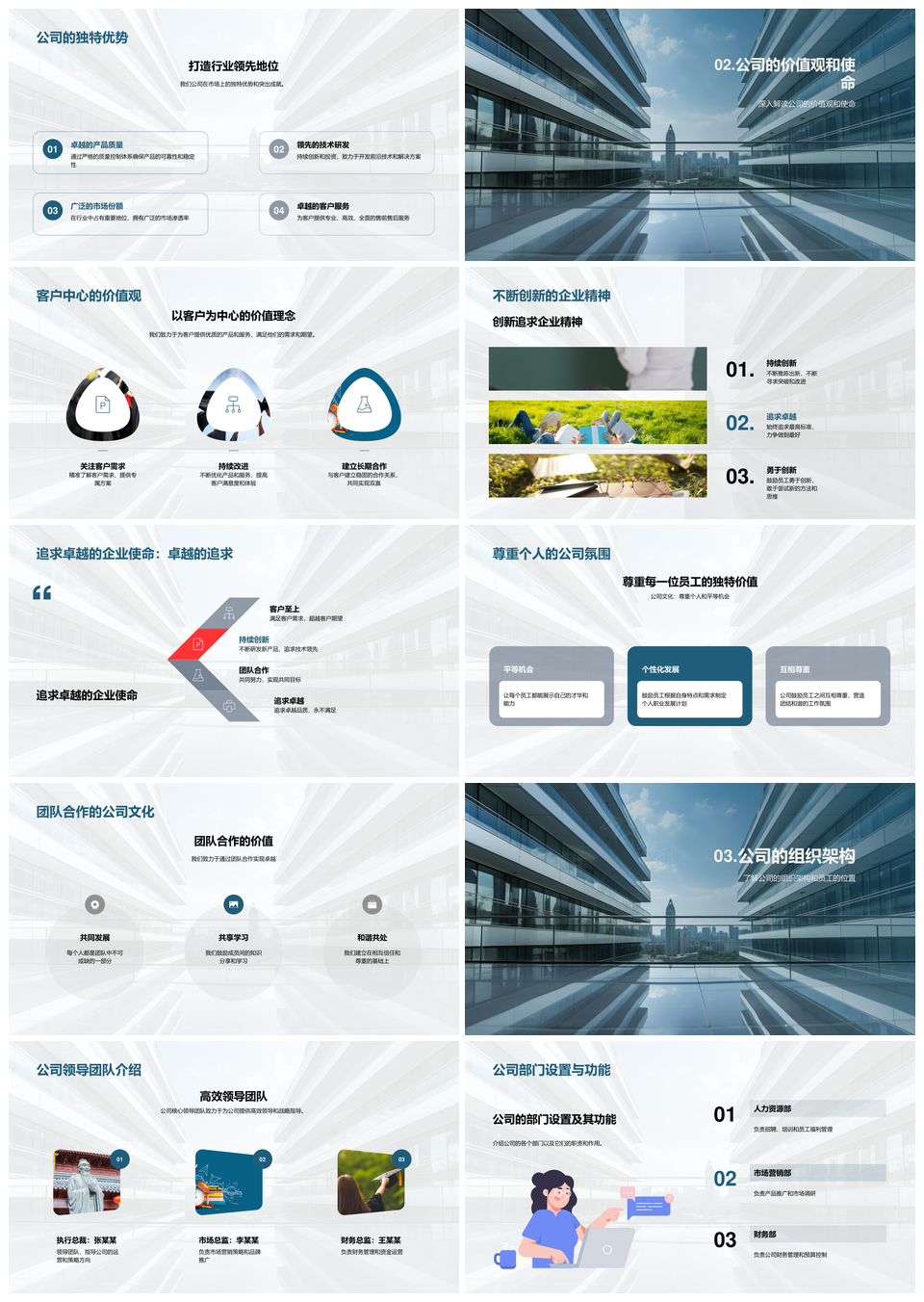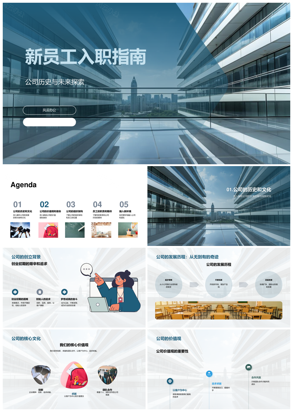 这是一张新员工入职公司历史价值观文化架构职责团队合作创新大楼PPT模板,包含新员工、入职、公司、历史、价值观、文化、架构、职责、团队、合作、创新、大楼等主题内容,也可用作新员工入职公司文化、公司历史价值观文化架构、职责团队合作创新大楼、新员工团队合作创新、公司历史价值观、价值观文化架构、文化架构职责团队、团队合作创新大楼、新员工入职、公司历史、价值观文化、文化架构、架构职责、团队合作创新、创新大楼等PPT场景使用。 风云办公提供的新员工入职公司历史价值观文化架构职责团队合作创新大楼PPT模板,下载格式为pptx,一共33页,作品中文字及图均可以修改和编辑,图片更改请在作品中右键图片并更换,文字修改请直接点击文字进行修改。