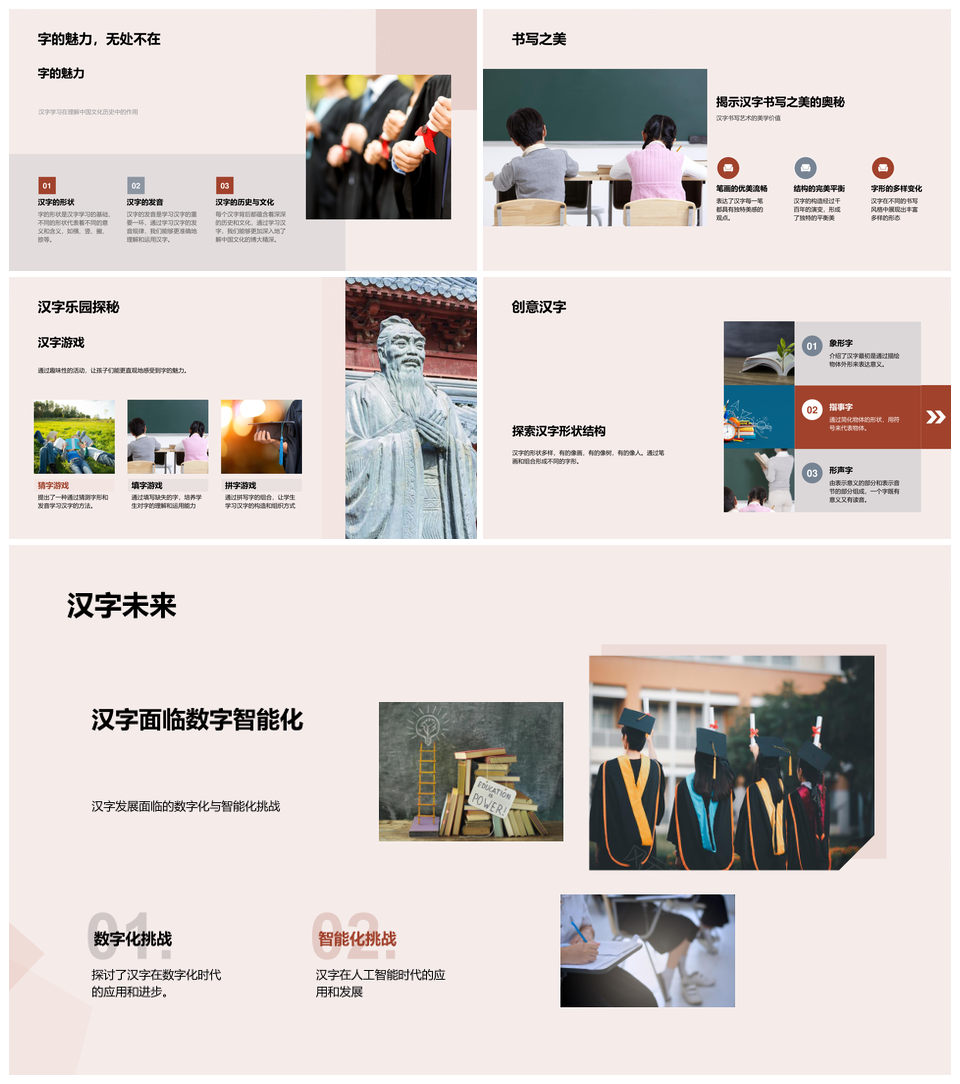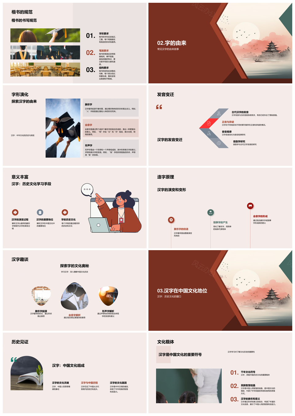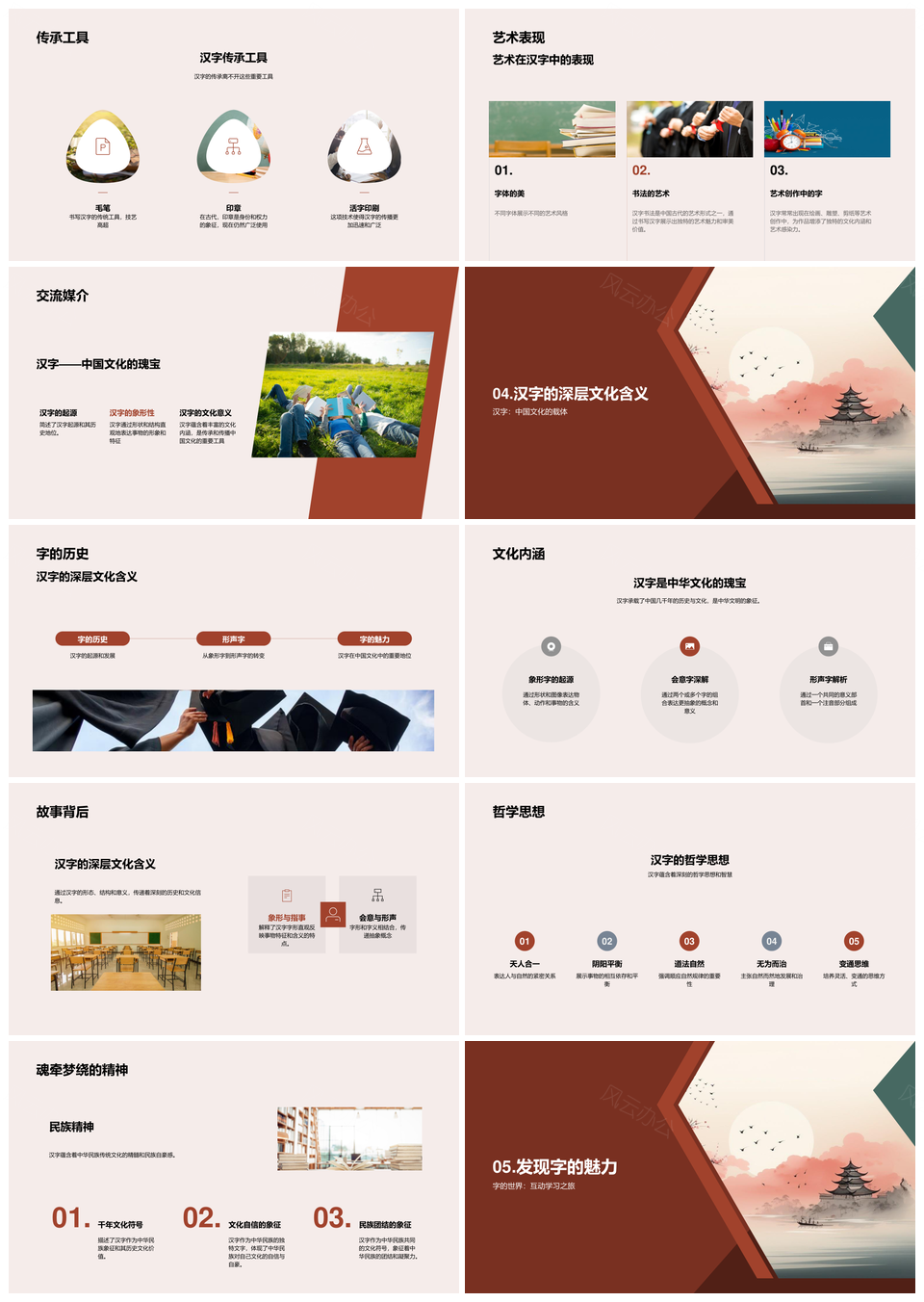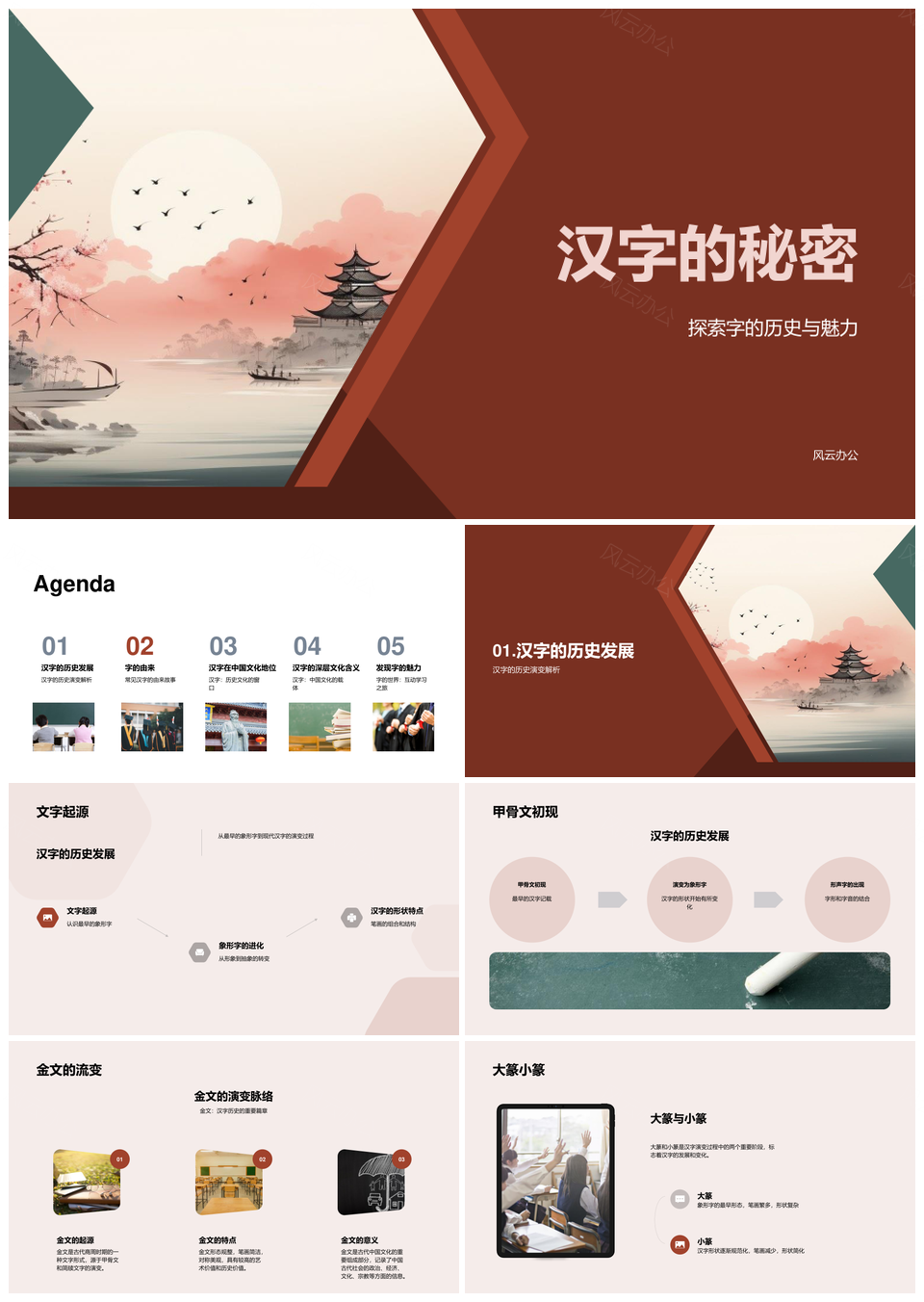风云办公提供的汉字演变象形形声书法文化探源PPT模板,下载格式为pptx,一共33页,作品中文字及图均可以修改和编辑,图片更改请在作品中右键图片并更换,文字修改请直接点击文字进行修改。