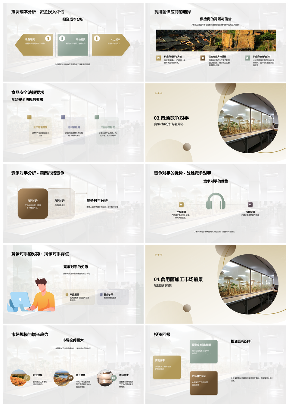 这是一张食用菌加工创业计划书引农林牧渔投资关注PPT模板,包含食用菌、加工、创业计划书、引、农林牧渔、投资、关注等主题内容,也可用作食用菌加工创业计划书、农林牧渔投资关注、食用菌加工创业、食用菌加工计划书、食用菌创业计划书、加工创业计划书、创业计划书农林牧渔、食用菌加工、食用菌创业、食用菌计划书、加工创业、加工计划书、创业计划书、农林牧渔投资、投资关注等PPT场景使用。 风云办公提供的食用菌加工创业计划书引农林牧渔投资关注PPT模板,下载格式为pptx,一共23页,作品中文字及图均可以修改和编辑,图片更改请在作品中右键图片并更换,文字修改请直接点击文字进行修改。