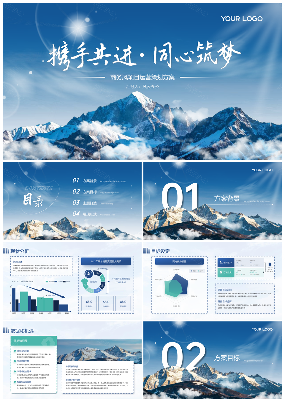 风云办公提供的蓝绿色商务个人总结工作计划PPT模板,下载格式为pptx,一共19页,作品中文字及图均可以修改和编辑,图片更改请在作品中右键图片并更换,文字修改请直接点击文字进行修改。