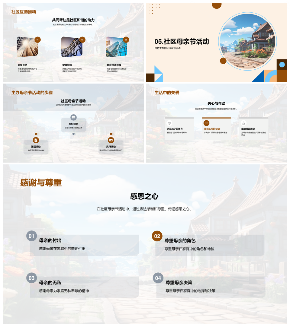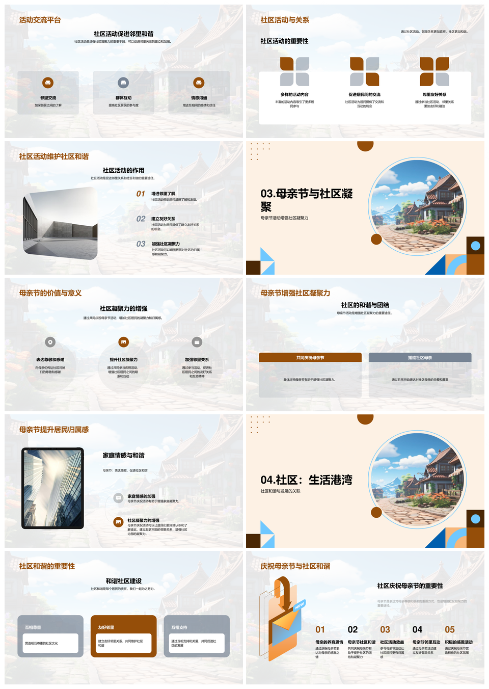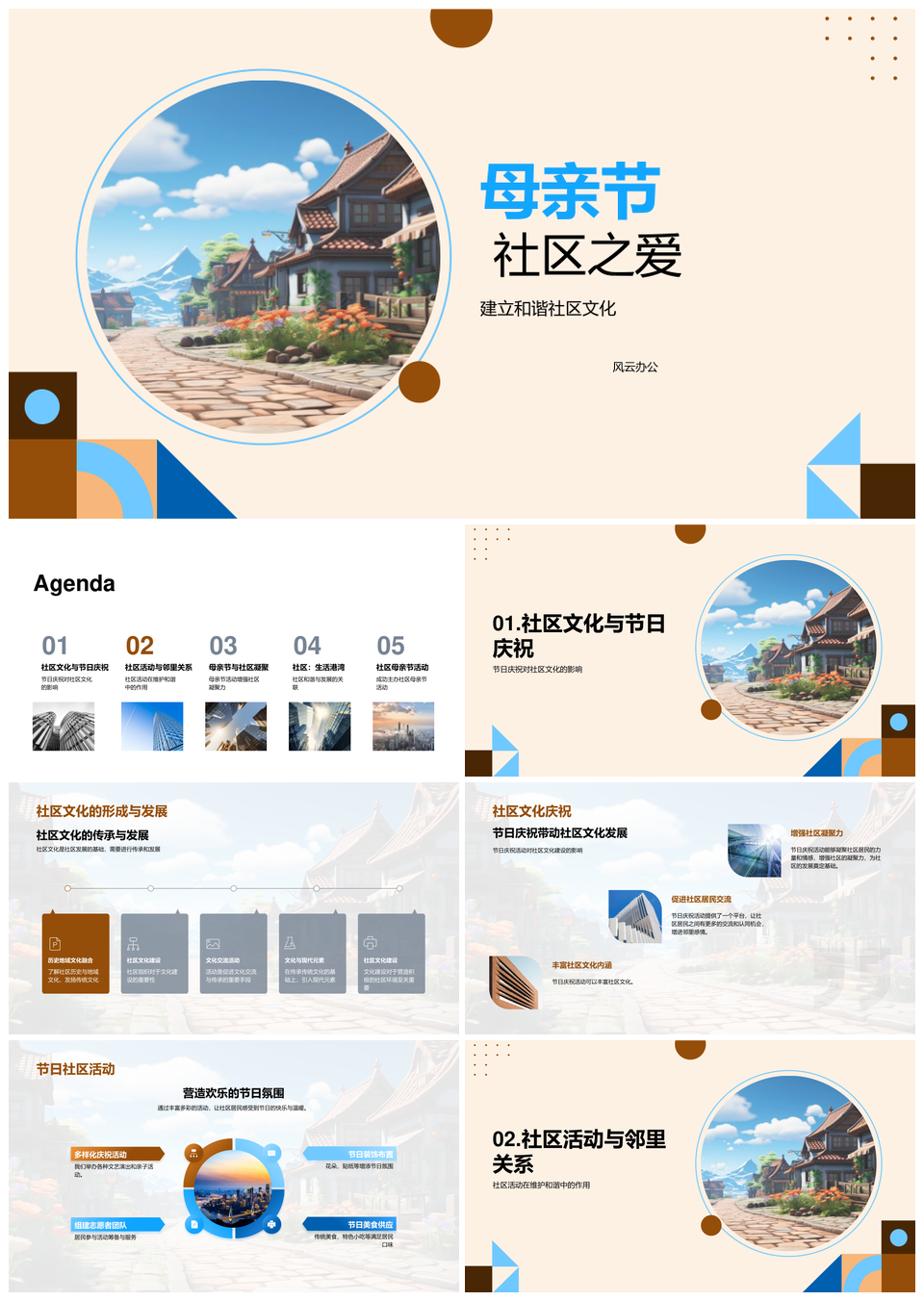 风云办公提供的母亲节社区赠花庆和谐邻里爱PPT模板,下载格式为pptx,一共23页,作品中文字及图均可以修改和编辑,图片更改请在作品中右键图片并更换,文字修改请直接点击文字进行修改。