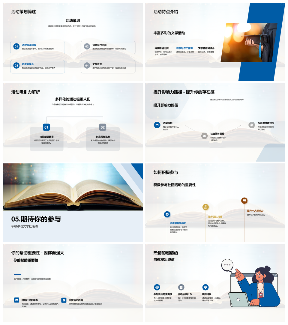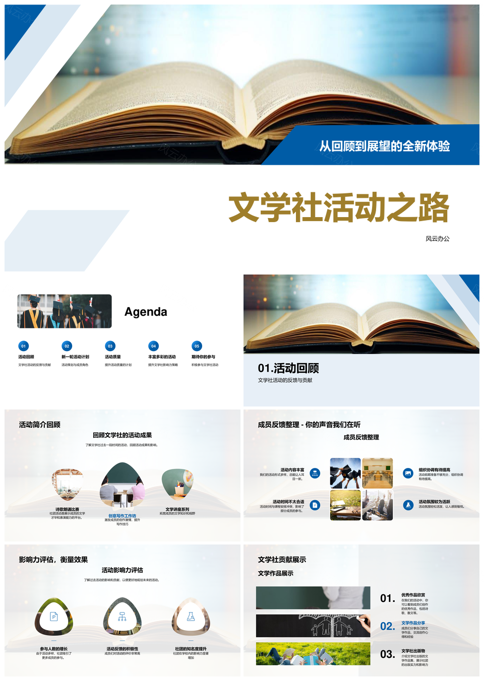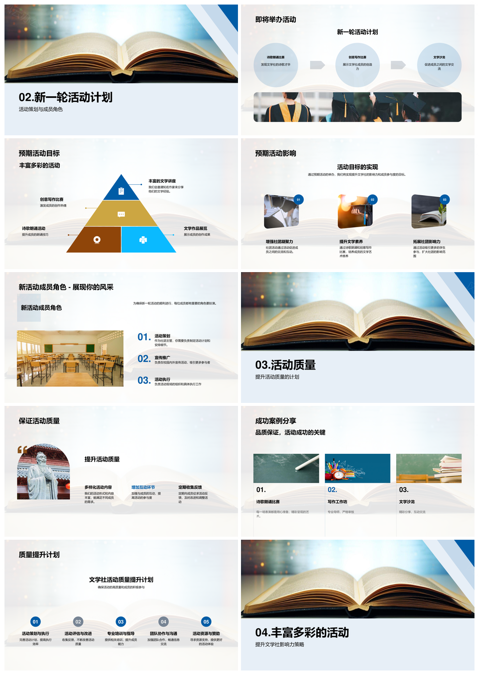 文学社活动回顾展望新计划提升质量影响PPT模板推荐