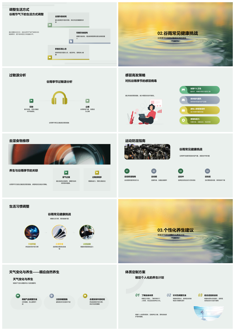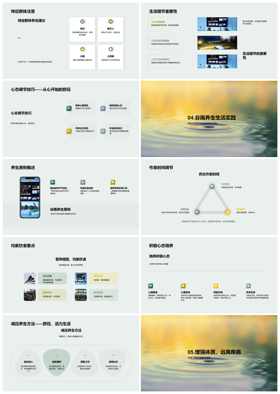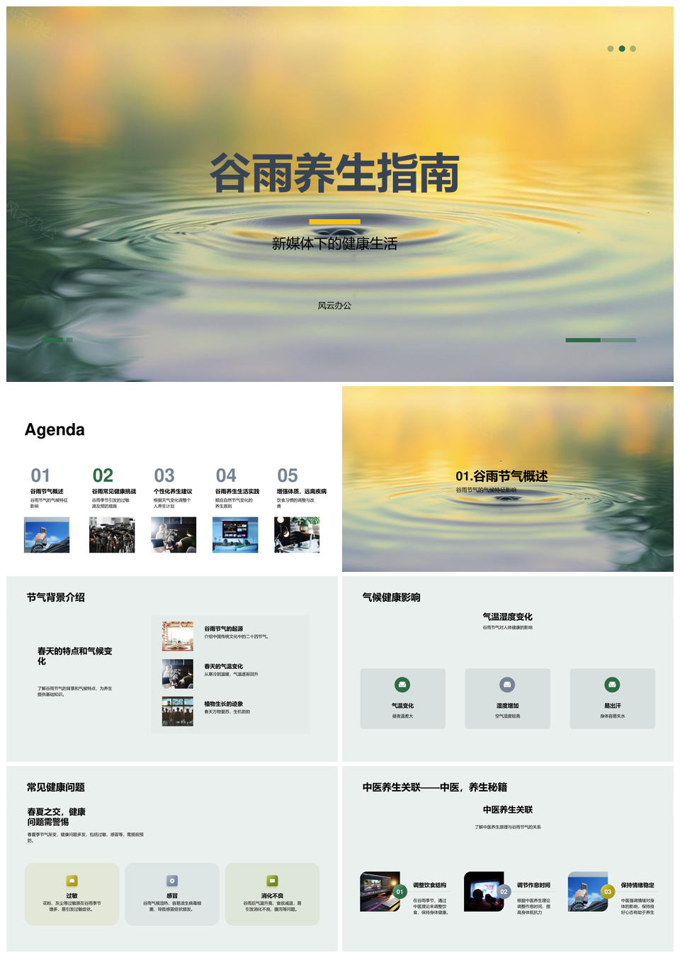 这是一张谷雨中医养生健康生活指南PPT模板,包含谷雨、中医、养生、健康、生活、指南等主题内容,也可用作谷雨中医养生健康、中医养生健康生活、养生健康生活指南、谷雨中医养生、中医养生健康、养生健康生活、健康生活指南、谷雨中医、中医养生、养生健康、健康生活、生活指南、谷雨养生、养生指南、健康指南等PPT场景使用。 风云办公提供的谷雨中医养生健康生活指南PPT模板,下载格式为pptx,一共33页,作品中文字及图均可以修改和编辑,图片更改请在作品中右键图片并更换,文字修改请直接点击文字进行修改。