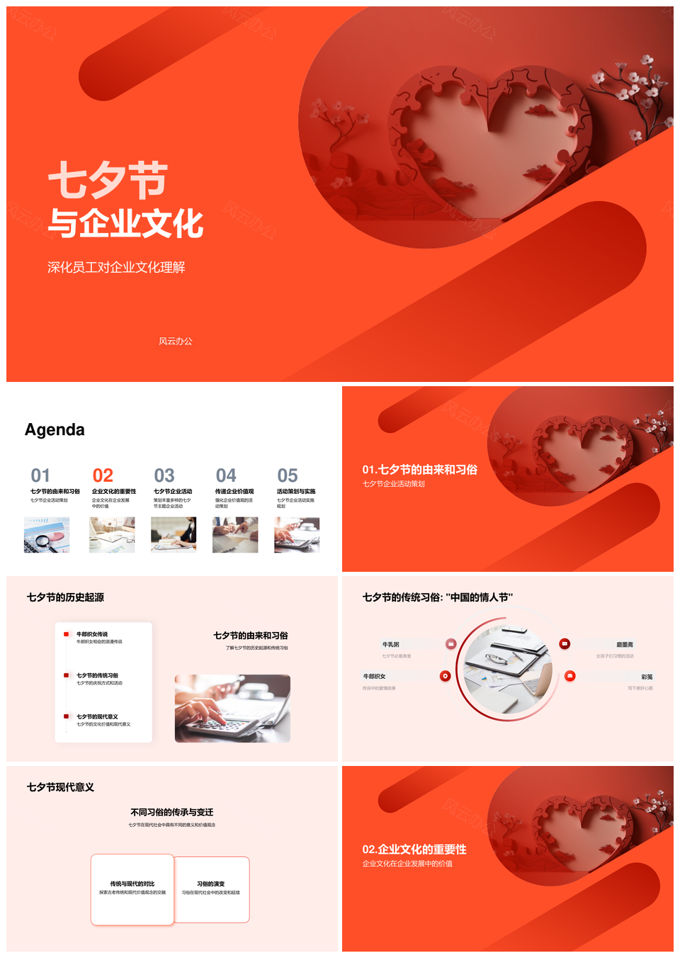 风云办公提供的七夕企业文化活动提升员工满意度PPT模板,下载格式为pptx,一共23页,作品中文字及图均可以修改和编辑,图片更改请在作品中右键图片并更换,文字修改请直接点击文字进行修改。