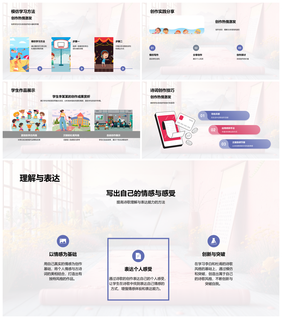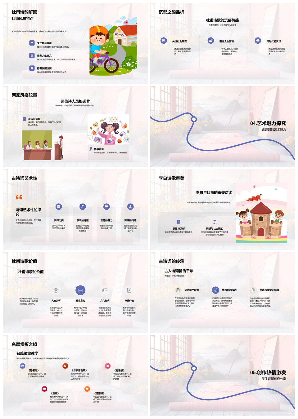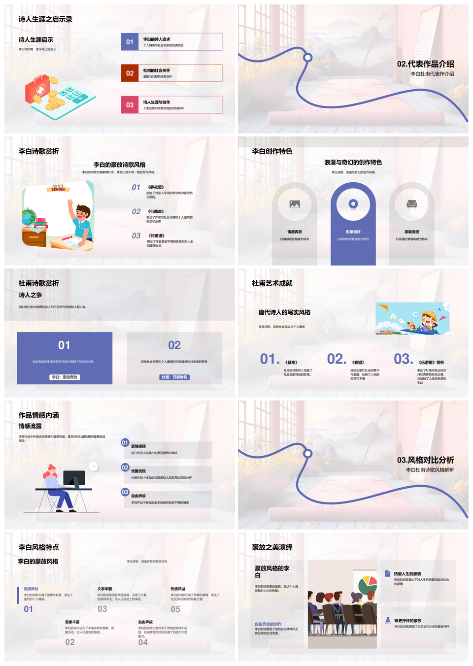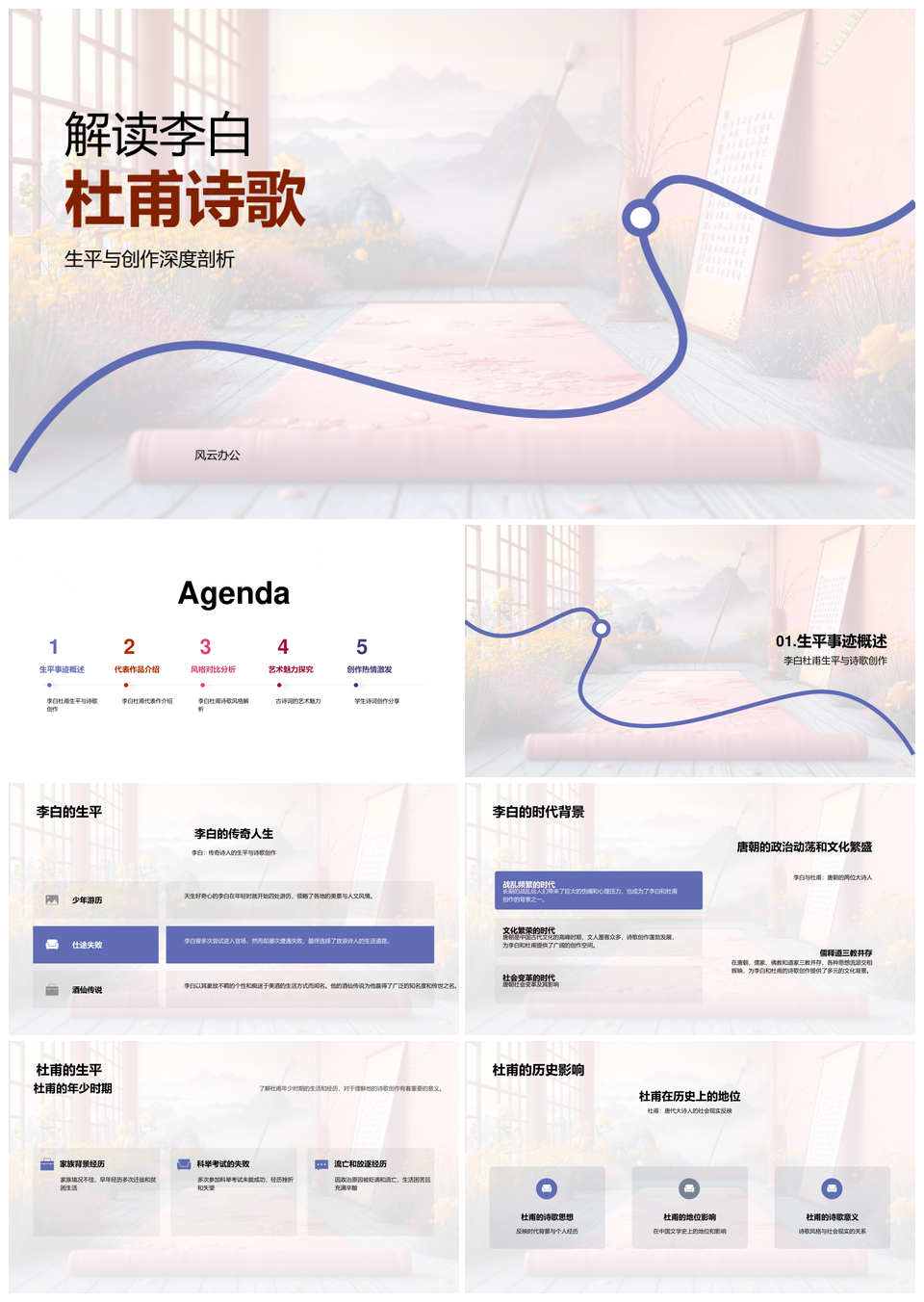 这是一张唐代诗人李白杜甫诗歌创作风格生平解析PPT模板,包含唐代诗人、李白、杜甫、诗歌创作风格、生平解析等主题内容,也可用作唐代诗人李白杜甫诗歌、诗人李白杜甫诗歌创作、李白杜甫诗歌创作风格、杜甫诗歌创作风格生平、诗歌创作风格生平解析、唐代诗人李白杜甫、诗人李白杜甫诗歌、李白杜甫诗歌创作、杜甫诗歌创作风格、诗歌创作风格生平、创作风格生平解析、唐代诗人李白、诗人李白杜甫、李白杜甫诗歌、杜甫诗歌创作、诗歌创作风格、创作风格生平、风格生平解析、唐代诗人、诗歌创作、创作风格、生平解析等PPT场景使用。 风云办公提供的唐代诗人李白杜甫诗歌创作风格生平解析PPT模板,下载格式为pptx,一共33页,作品中文字及图均可以修改和编辑,图片更改请在作品中右键图片并更换,文字修改请直接点击文字进行修改。