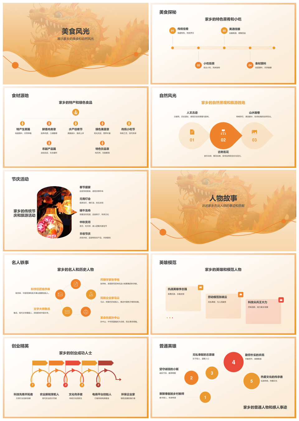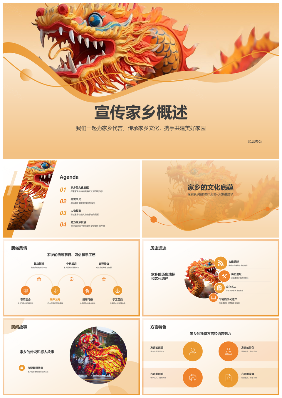 风云办公提供的家乡传统节日舞龙中国龙宣传PPT模板,下载格式为pptx,一共23页,作品中文字及图均可以修改和编辑,图片更改请在作品中右键图片并更换,文字修改请直接点击文字进行修改。