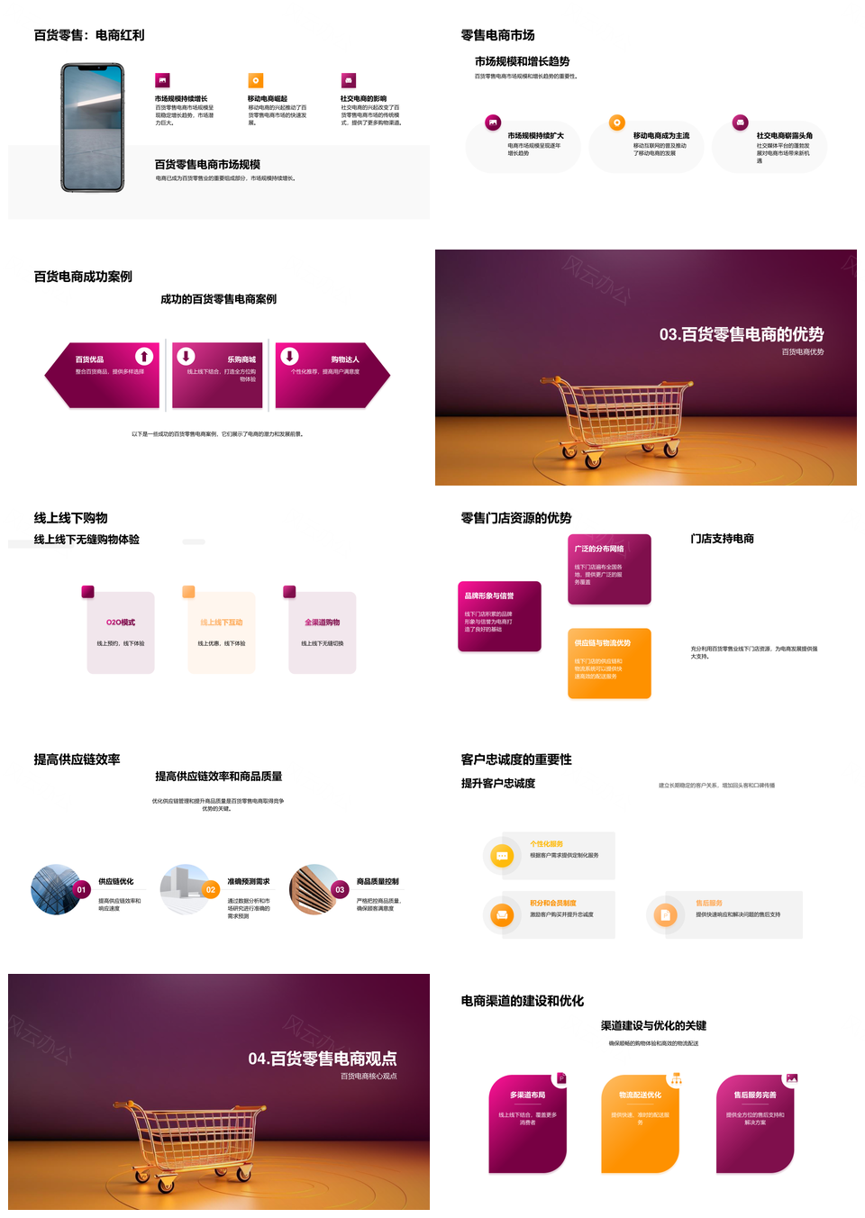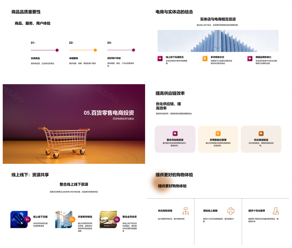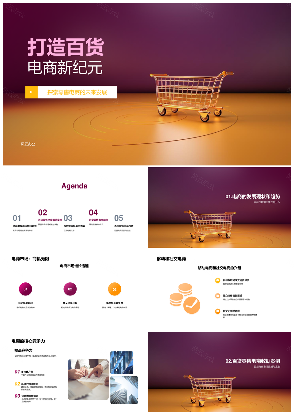 风云办公提供的零售业百货电商移动社交规模增长趋势PPT模板,下载格式为pptx,一共24页,作品中文字及图均可以修改和编辑,图片更改请在作品中右键图片并更换,文字修改请直接点击文字进行修改。