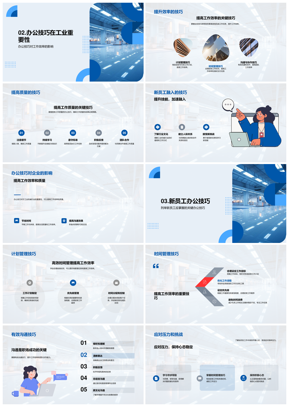 风云办公提供的工业机械新员工办公技巧提升效质PPT模板,下载格式为pptx,一共28页,作品中文字及图均可以修改和编辑,图片更改请在作品中右键图片并更换,文字修改请直接点击文字进行修改。
