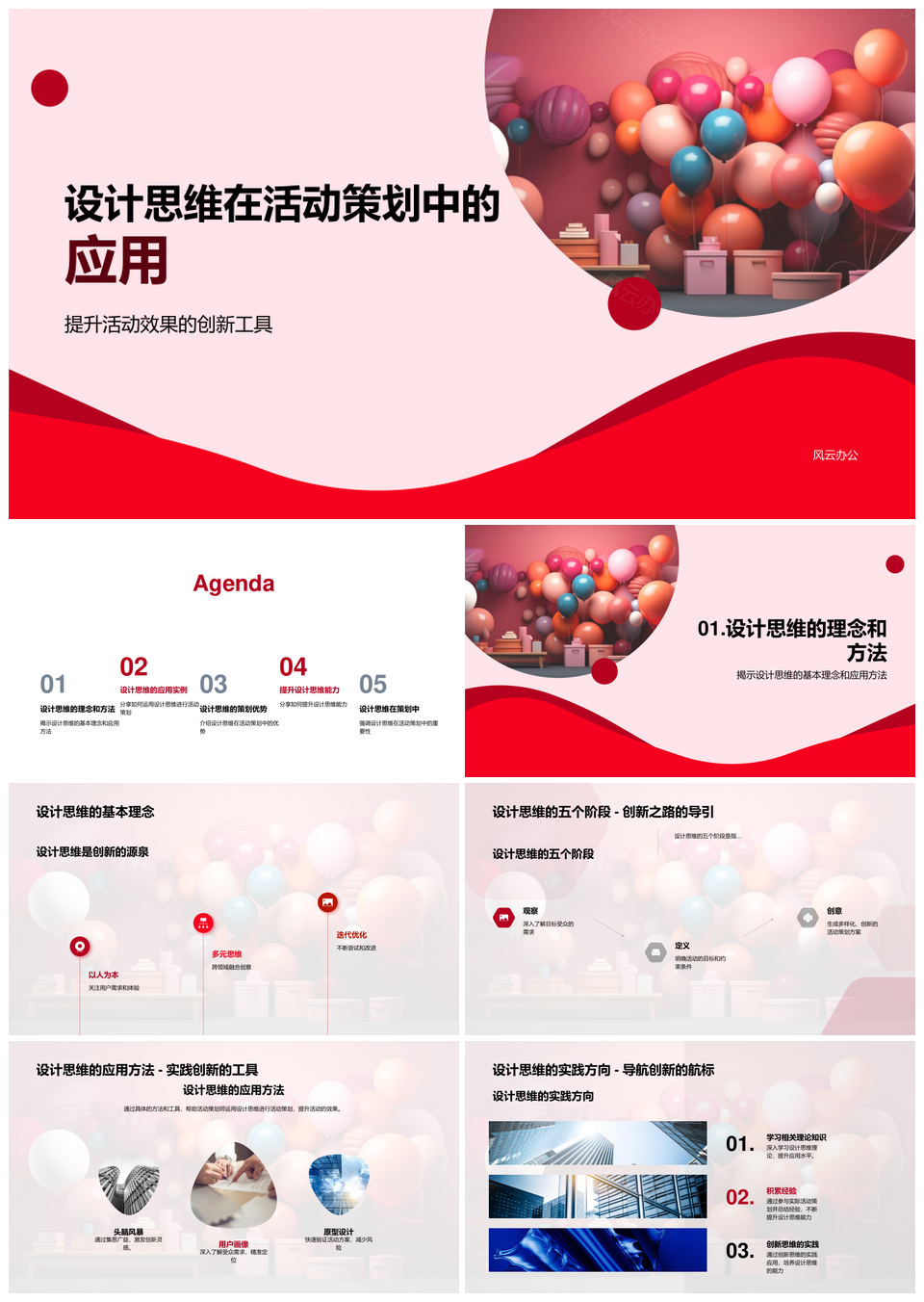 风云办公提供的设计思维五阶段驱动艺术活动策划创新PPT模板,下载格式为pptx,一共33页,作品中文字及图均可以修改和编辑,图片更改请在作品中右键图片并更换,文字修改请直接点击文字进行修改。