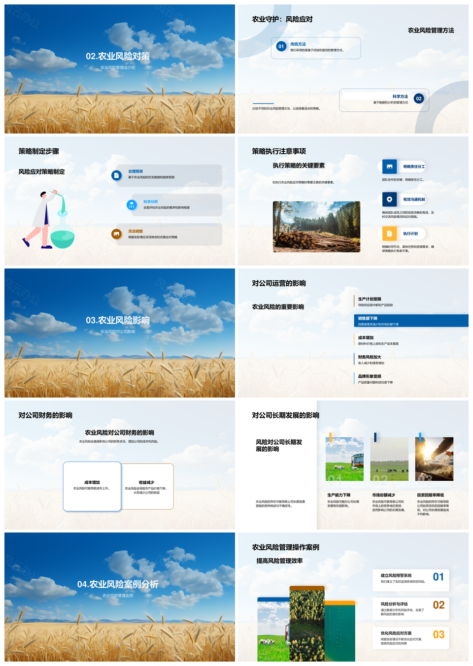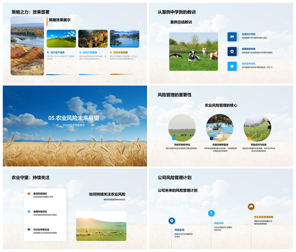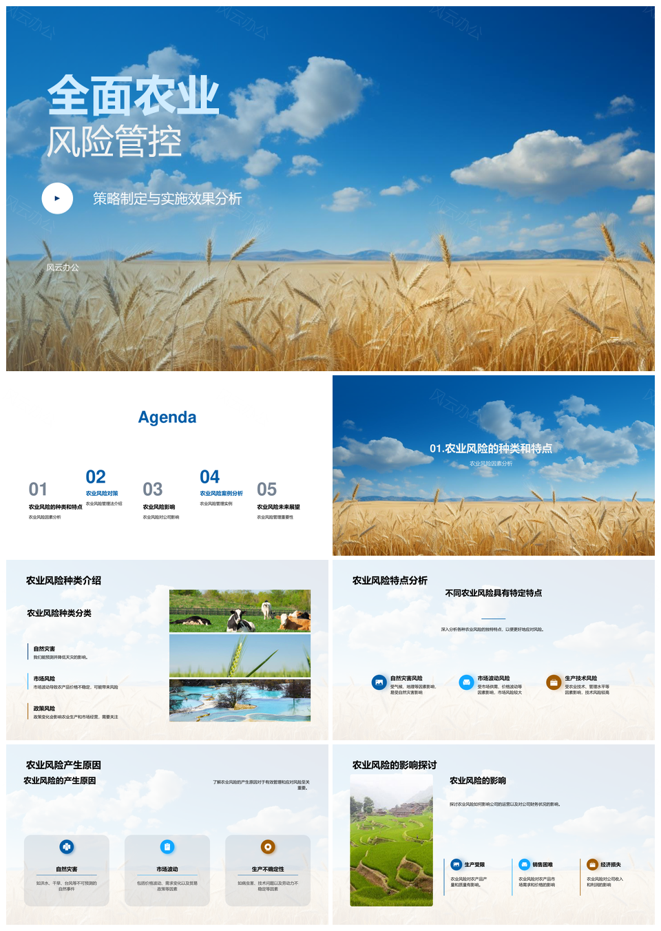 风云办公提供的农业风险管理策略实施效果与长期发展PPT模板,下载格式为pptx,一共24页,作品中文字及图均可以修改和编辑,图片更改请在作品中右键图片并更换,文字修改请直接点击文字进行修改。