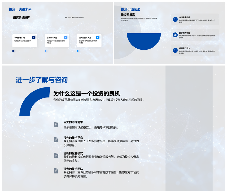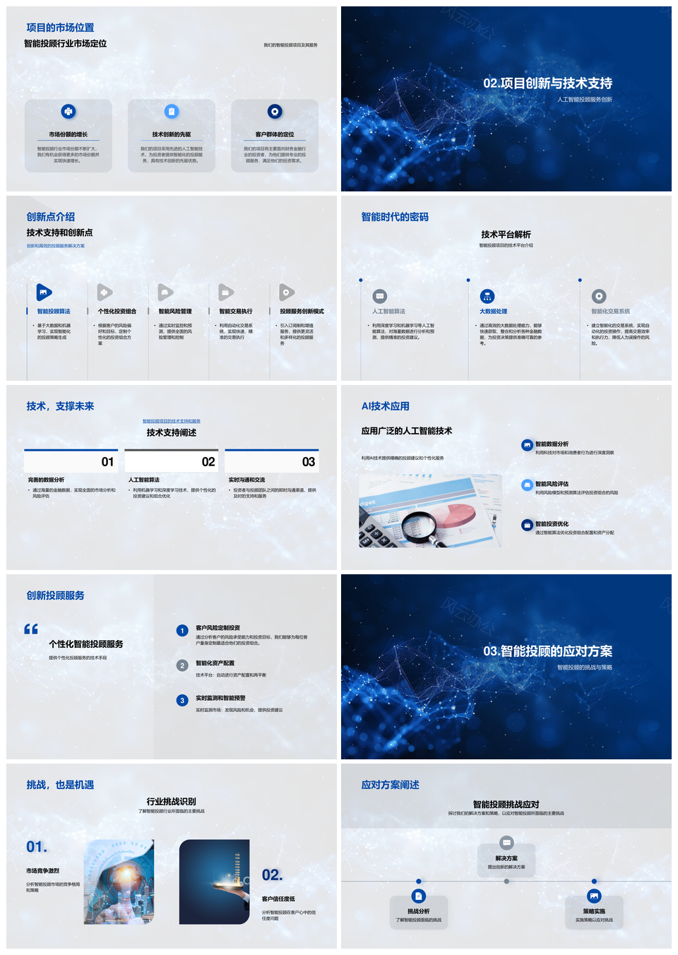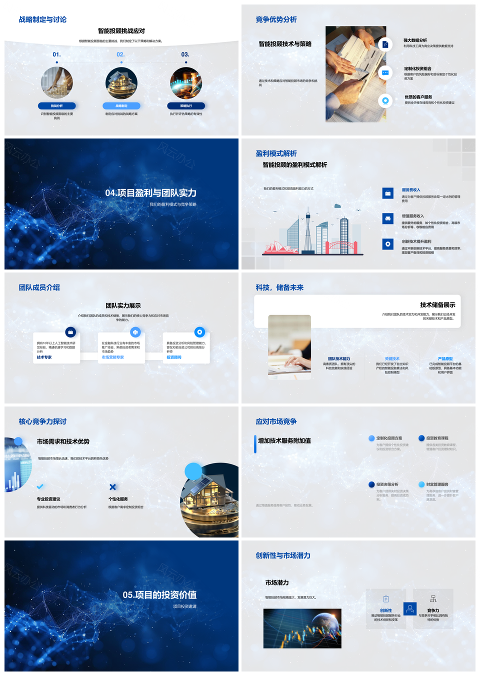 这是一张智能投顾新趋势创业路演市场规模增长竞争技术PPT模板,包含智能投顾、新趋势、创业、路演、市场、规模、增长、竞争、技术等主题内容,也可用作智能投顾新趋势创业路演、新趋势创业路演市场规模、创业路演市场规模增长、路演市场规模增长竞争、市场规模增长竞争技术、智能投顾市场规模增长竞争、智能投顾新趋势市场规模增长、新趋势市场规模增长竞争、智能投顾新趋势创业路演、创业路演市场规模增长竞争、市场规模增长竞争技术趋势、智能投顾新趋势创业、新趋势创业路演、创业路演市场规模、市场规模增长竞争等PPT场景使用。 风云办公提供的智能投顾新趋势创业路演市场规模增长竞争技术PPT模板,下载格式为pptx,一共31页,作品中文字及图均可以修改和编辑,图片更改请在作品中右键图片并更换,文字修改请直接点击文字进行修改。