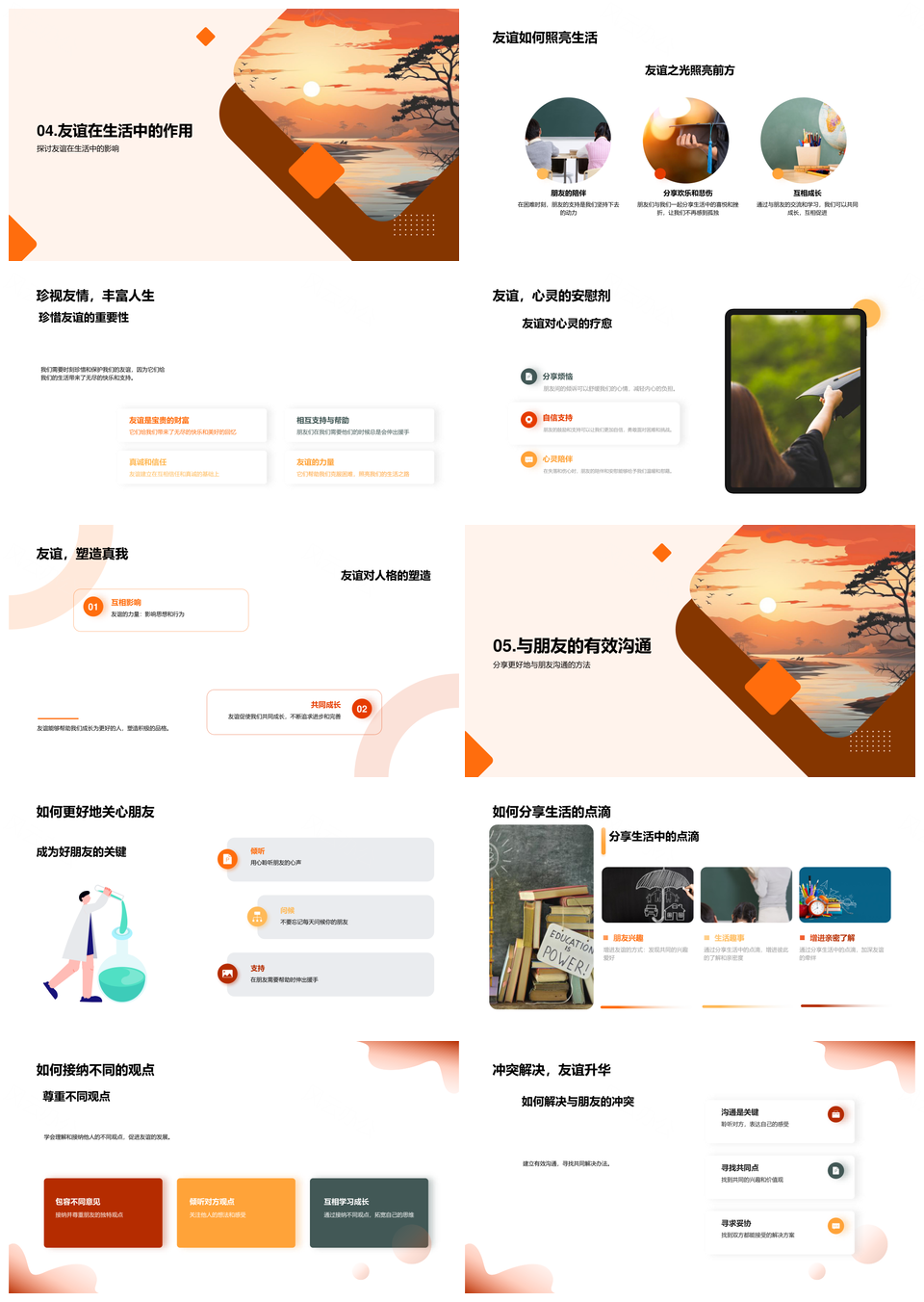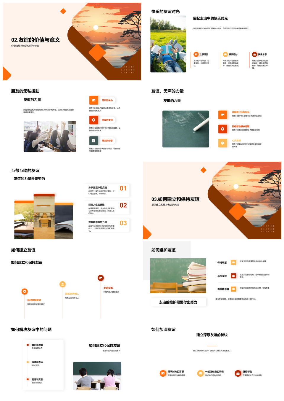 这款模板以温暖的低饱和色系为核心,选用橙色、米色、驼色层层递进,搭配浅卡其与沙色作为过渡,构建出柔和协调的视觉基调。治愈系的森色滤镜与日系留白手法结合,既能满足企业汇报、读书分享等场景的专业需求,又保持着自然灵动的呼吸感。通过几何线条与植物剪影的错落组合,在商务气质中融入文艺调性,每页布局支持深度内容拓展却不显拥挤。内置23种科学配色方案可快速适配课件、提案等不同场景,矢量化图表元素支持灵活重组,兼顾视觉舒适度与信息传递效率,尤其适合教育、文创类内容呈现。