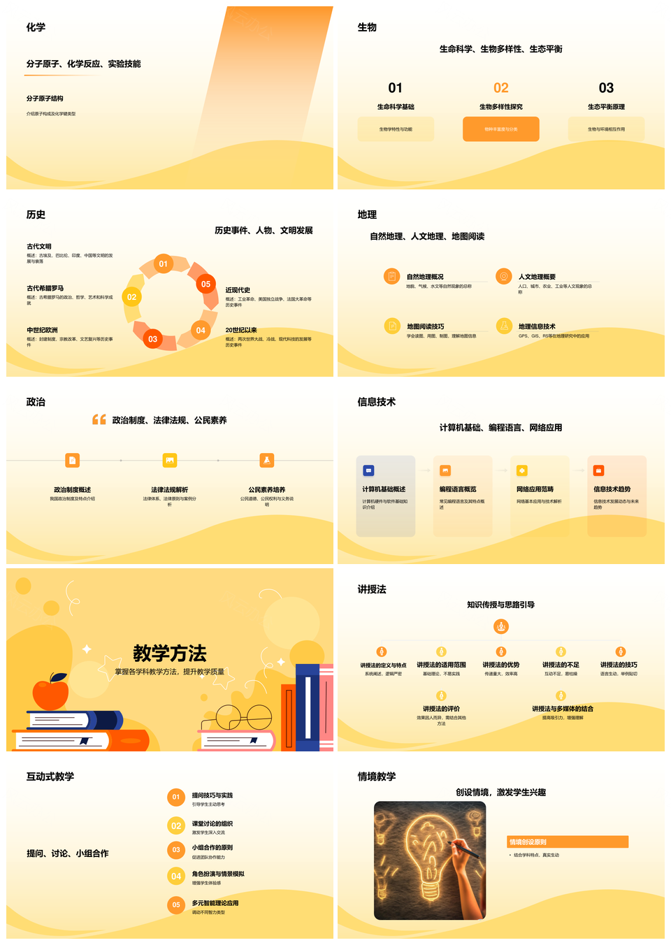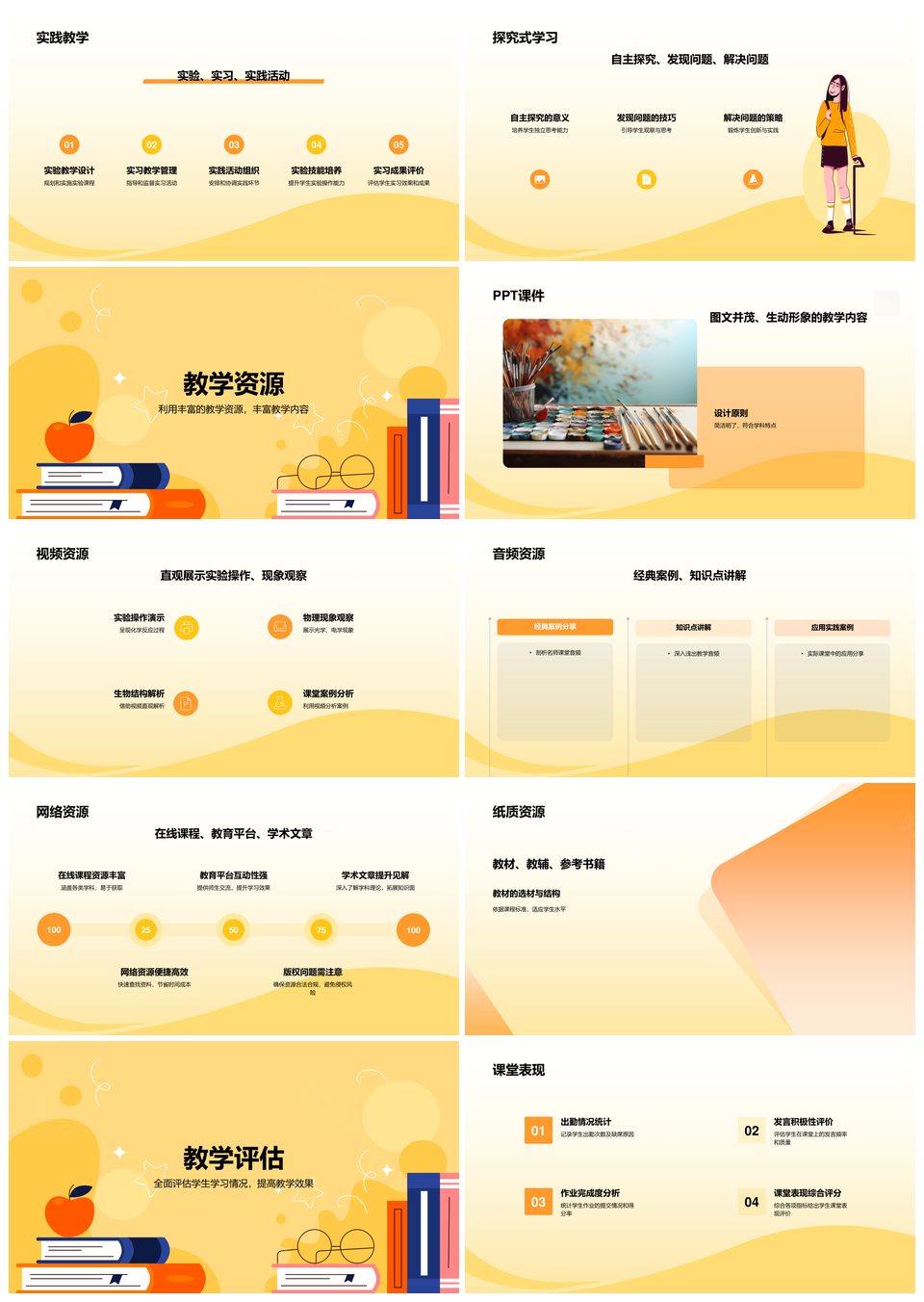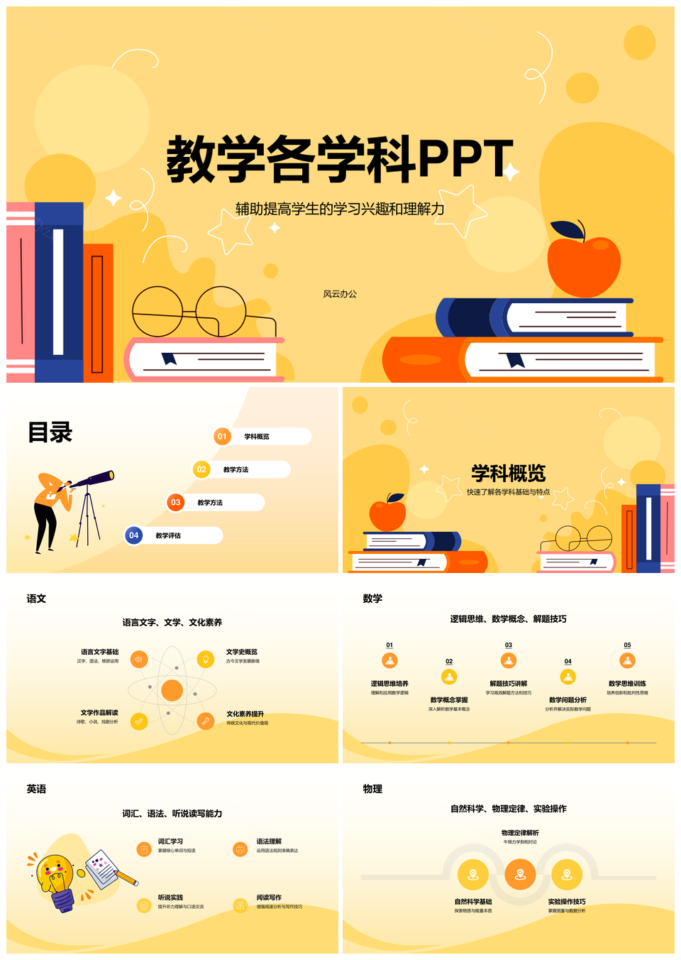 风云办公提供的黄色插画多学科教学PPT教育应用制作,下载格式为pptx,一共31页,作品中文字及图均可以修改和编辑,图片更改请在作品中右键图片并更换,文字修改请直接点击文字进行修改。