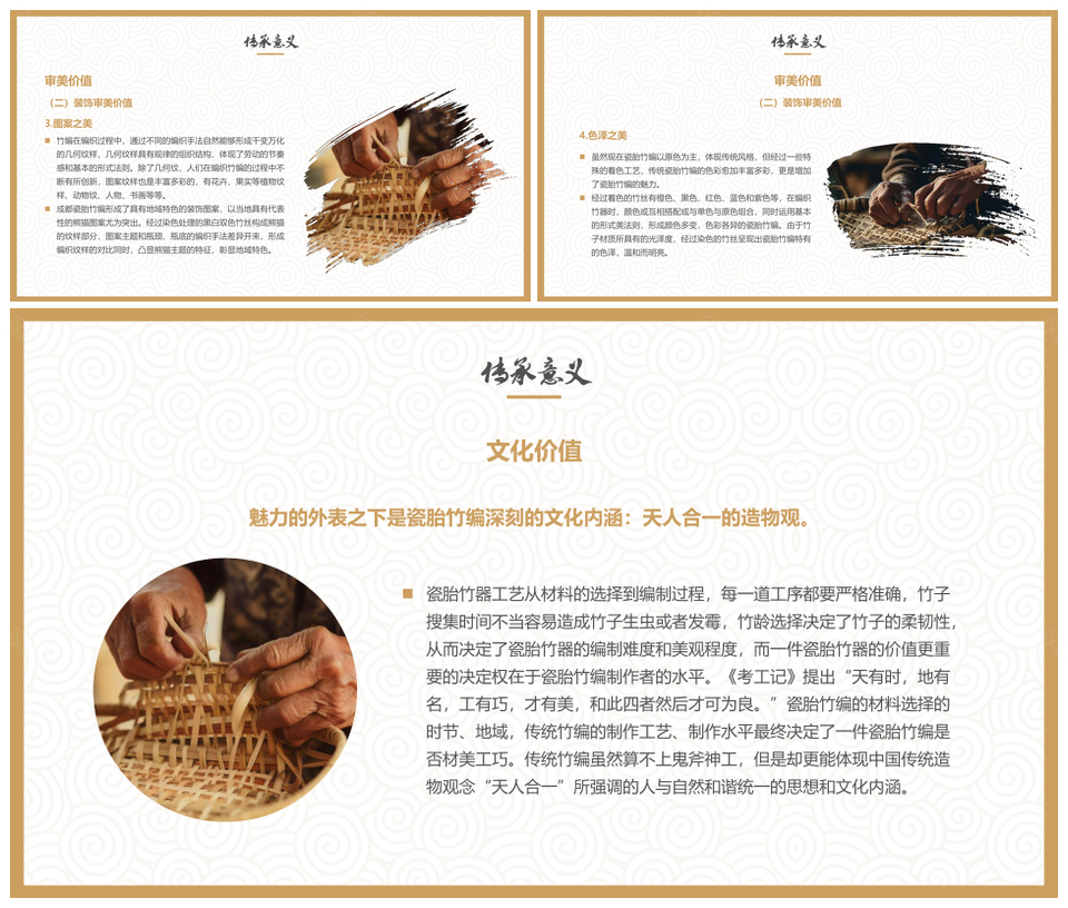 这是一张非遗竹编竹器竹篓实拍传承讲座文化科普PPT模板,包含非遗、竹编、竹器、竹篓、实拍、传承、讲座、文化、科普等主题内容,也可用作非遗竹编竹器竹篓、非遗竹编传承文化科普、竹编竹器竹篓实拍、非遗竹编文化科普、非遗实拍传承文化、竹器竹篓传承讲座、非遗竹编竹器实拍、非遗传承讲座文化、非遗竹编传承讲座、竹编实拍传承科普、非遗竹器文化科普、竹篓实拍文化科普、竹器传承讲座科普、实拍传承文化科普、非遗文化讲座科普等PPT场景使用。 风云办公提供的非遗竹编竹器竹篓实拍传承讲座文化科普PPT模板,下载格式为pptx,一共21页,作品中文字及图均可以修改和编辑,图片更改请在作品中右键图片并更换,文字修改请直接点击文字进行修改。