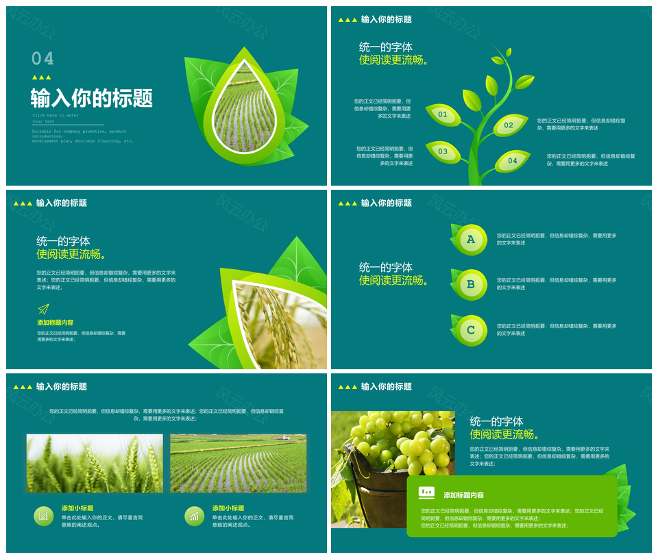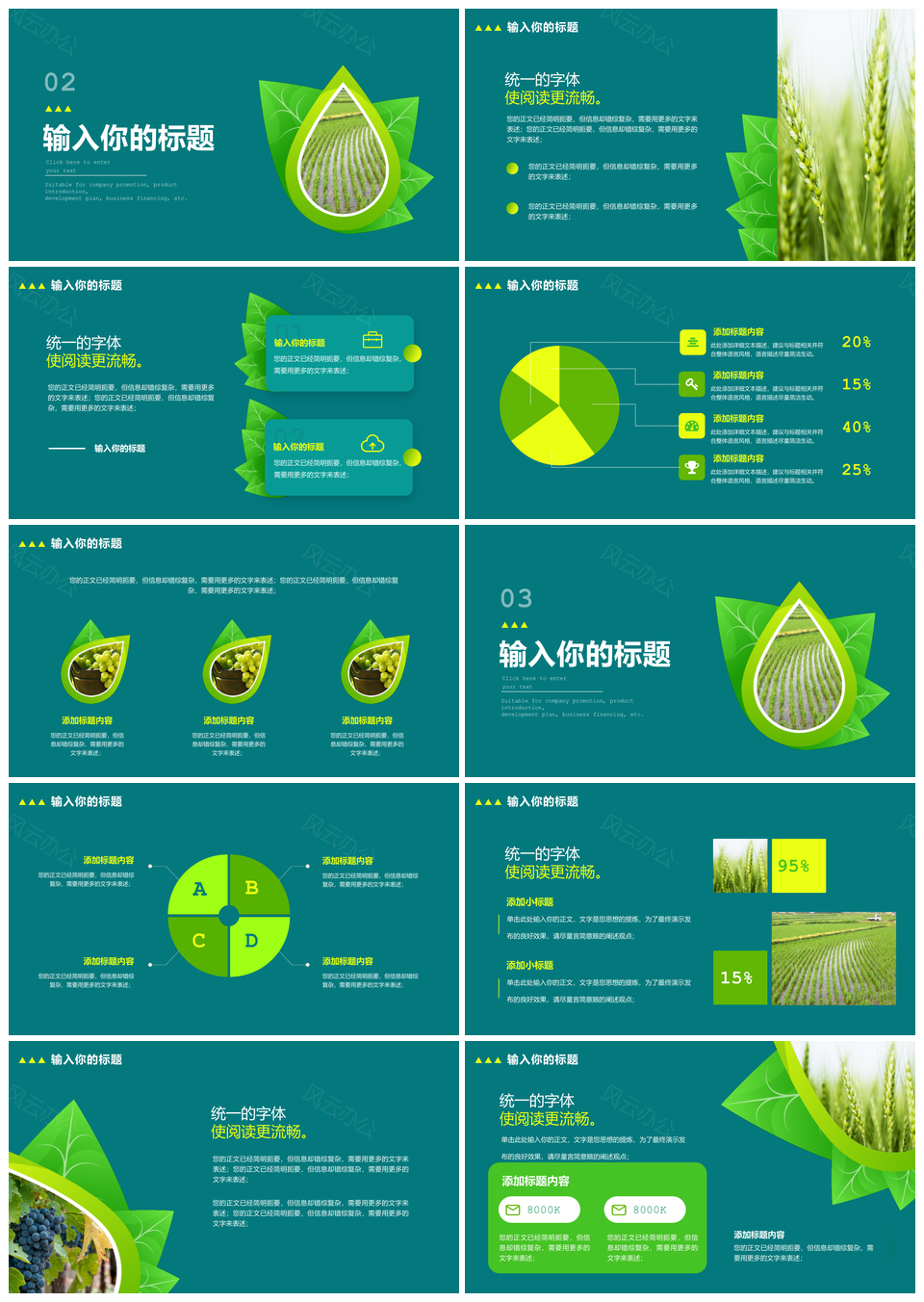 风云办公提供的欧美简约大气绿色农业项目计划书PPT模板,下载格式为pptx,一共24页,作品中文字及图均可以修改和编辑,图片更改请在作品中右键图片并更换,文字修改请直接点击文字进行修改。