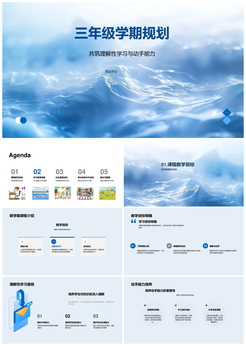 这是一张三年级学期规划理解动手学习家校互动情感发展PPT模板,包含三年级、学期规划、理解、动手学习、家校互动、情感发展等主题内容,也可用作三年级学期规划理解动手、学期规划理解动手学习、规划理解动手学习家校、理解动手学习家校互动、动手学习家校互动情感、学习家校互动情感发展、学期规划动手学习家校、规划动手学习家校互动、三年级规划理解动手学习、学期理解动手学习互动、动手学习互动情感发展、学期家校互动情感发展、三年级学期动手学习、学期规划家校互动、动手学习情感发展等PPT场景使用。 风云办公提供的三年级学期规划理解动手学习家校互动情感发展PPT模板,下载格式为pptx,一共26页,作品中文字及图均可以修改和编辑,图片更改请在作品中右键图片并更换,文字修改请直接点击文字进行修改。