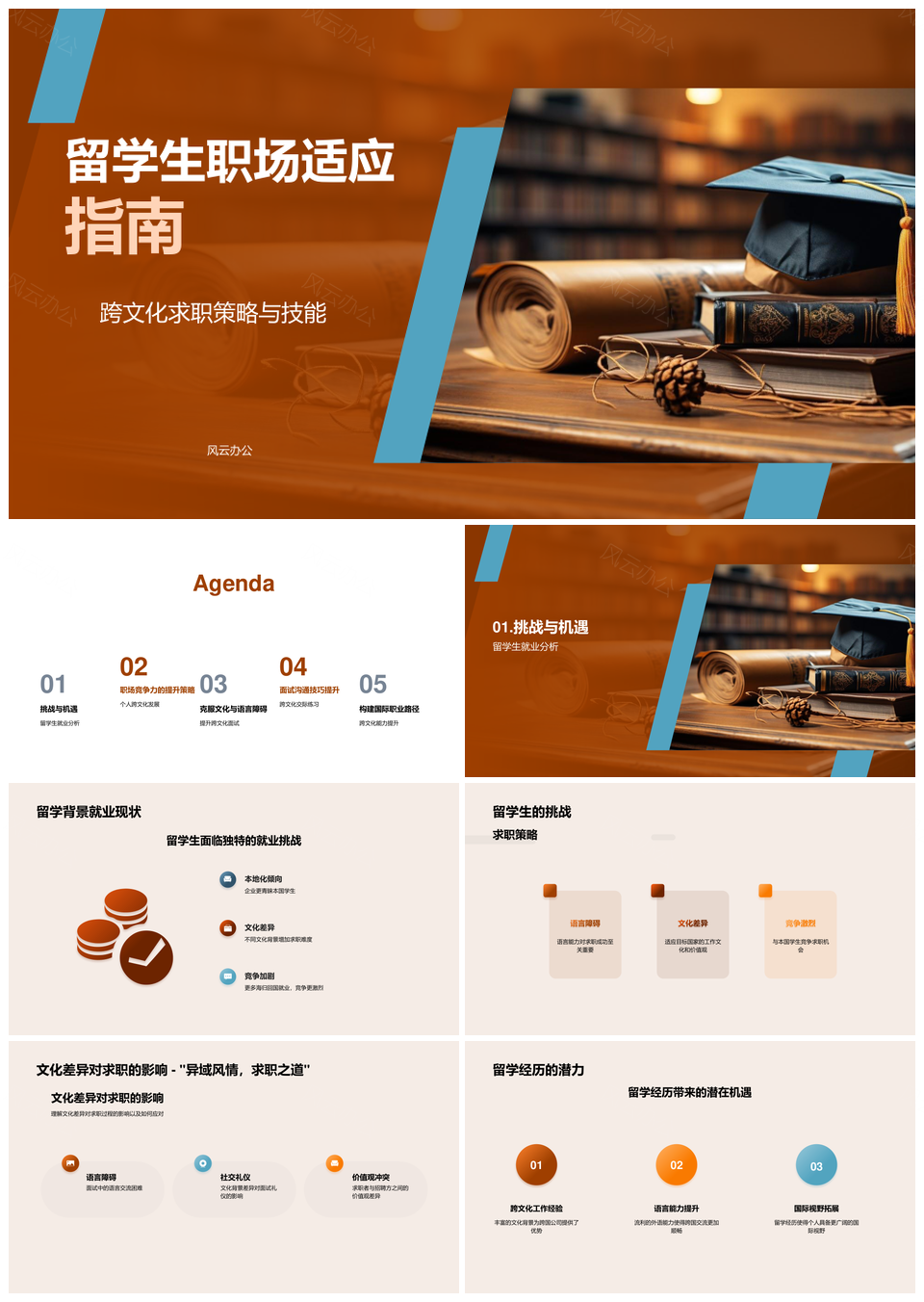 风云办公提供的留学生毕业帽到职场适应指南PPT模板,下载格式为pptx,一共28页,作品中文字及图均可以修改和编辑,图片更改请在作品中右键图片并更换,文字修改请直接点击文字进行修改。