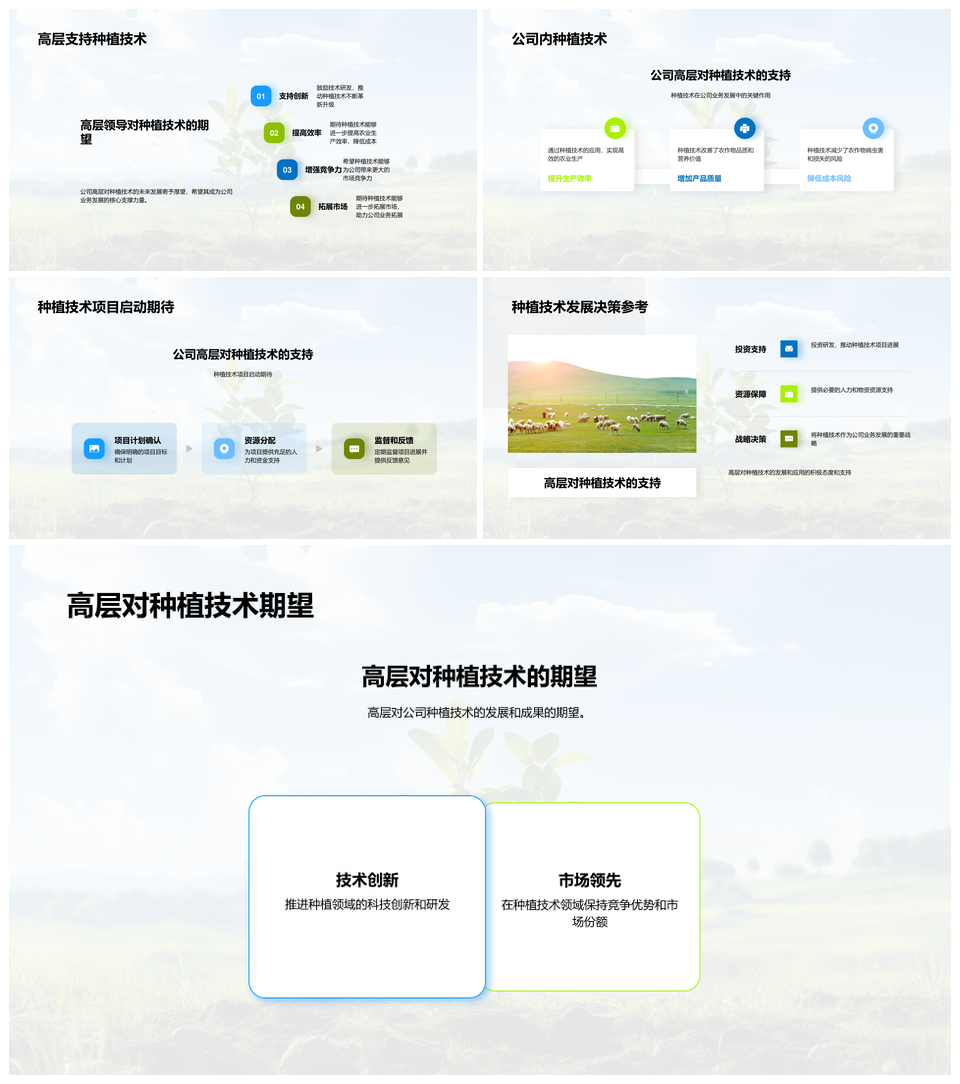 这是一张公司高层回顾种植技术研发规划农田新项目PPT模板,包含公司、高层、回顾、种植技术、研发、规划、农田、新项目等主题内容,也可用作公司高层回顾种植技术研发规划、公司高层回顾种植技术、种植技术研发规划农田、研发规划农田新项目、公司高层研发新项目、公司高层研发规划、研发规划新项目、规划农田新项目、种植技术研发规划、公司高层回顾研发、回顾种植技术研发、高层回顾研发、公司高层、种植技术、研发规划等PPT场景使用。 风云办公提供的公司高层回顾种植技术研发规划农田新项目PPT模板,下载格式为pptx,一共33页,作品中文字及图均可以修改和编辑,图片更改请在作品中右键图片并更换,文字修改请直接点击文字进行修改。