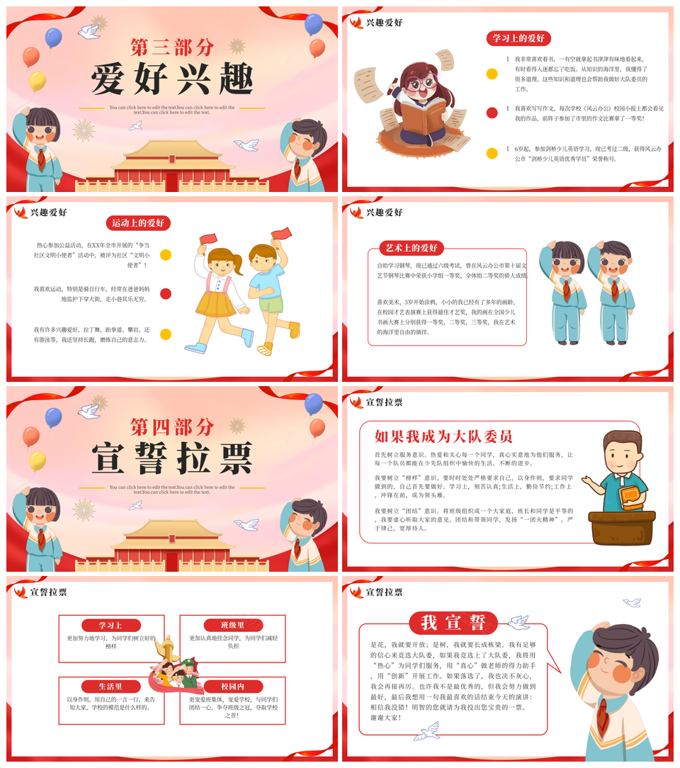 这是一张2025卡通清新少先队大队委竞选自我介绍PPT模板,包含2025、卡通、清新、少先队、大队委、竞选、自我介绍等主题内容,也可用作2025卡通清新少先队大队委竞选、卡通清新少先队大队委竞选、清新少先队大队委竞选自我介绍、少先队大队委竞选自我介绍、2025卡通清新少先队、卡通清新少先队大队委、清新少先队大队委竞选、少先队大队委竞选自我介绍、2025清新大队委竞选、卡通少先队竞选自我介绍、清新大队委竞选自我介绍、2025少先队竞选、卡通大队委自我介绍、清新少先队竞选、大队委竞选自我介绍等PPT场景使用。 风云办公提供的2025卡通清新少先队大队委竞选自我介绍PPT模板,下载格式为pptx,一共16页,作品中文字及图均可以修改和编辑,图片更改请在作品中右键图片并更换,文字修改请直接点击文字进行修改。