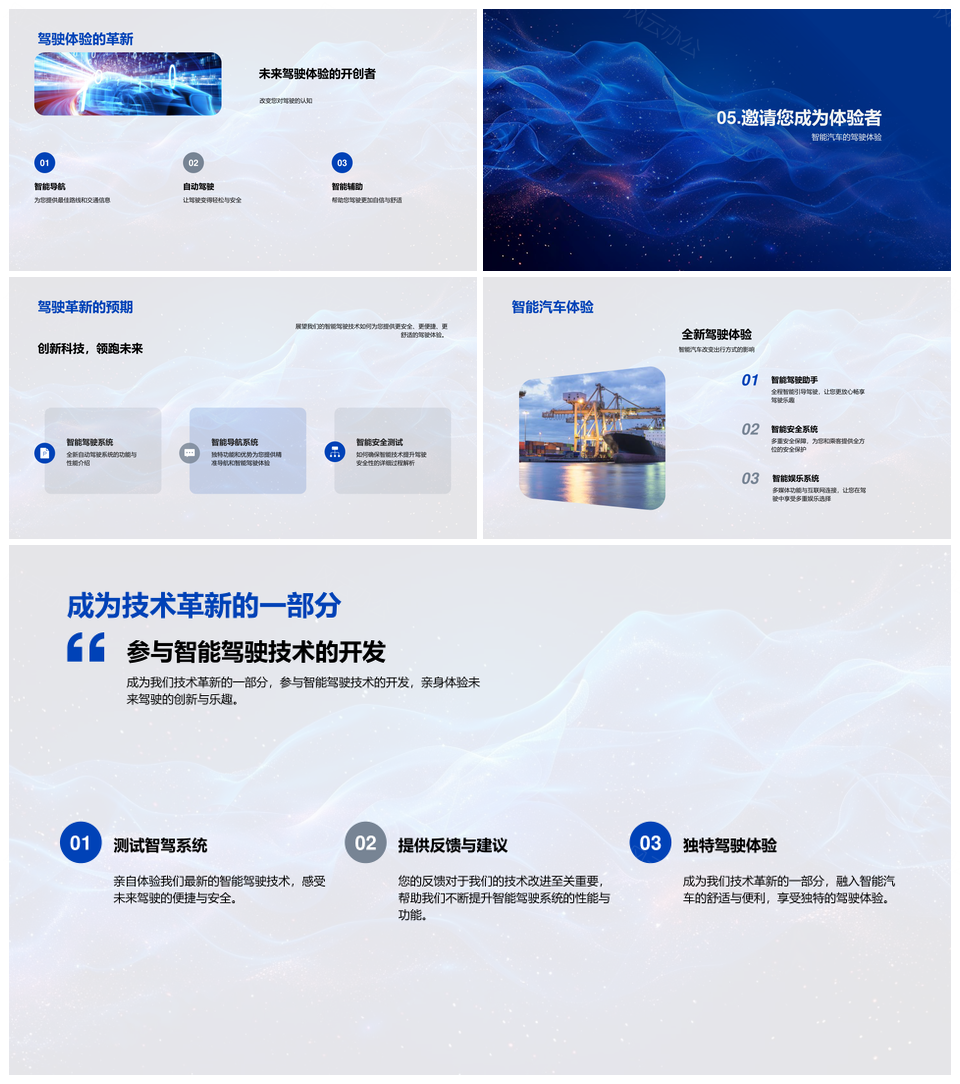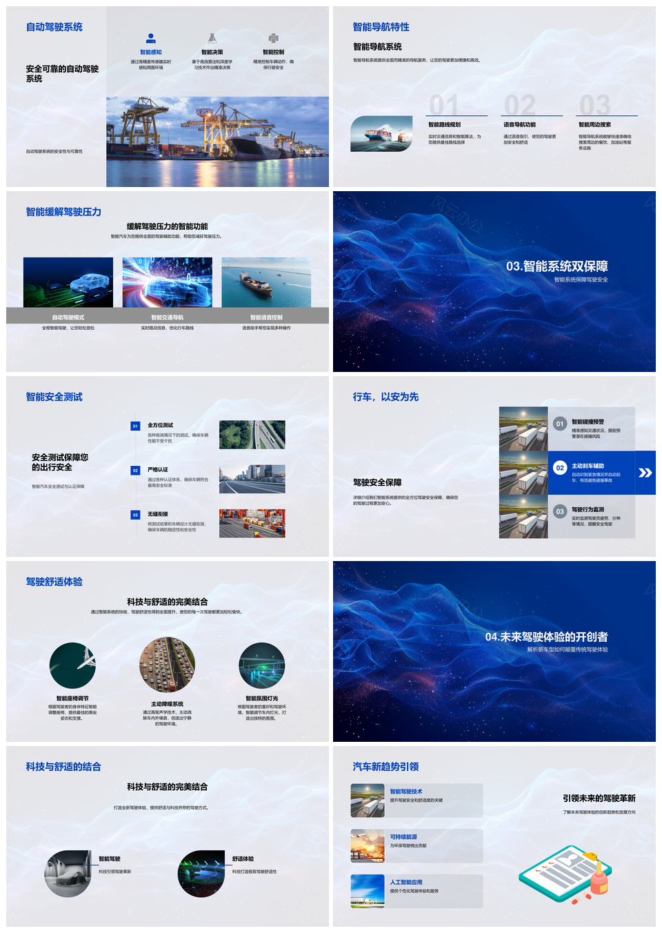 这是一张智能驾驶技术创新汽车行业安全驾享产品发布PPT模板,包含智能驾驶技术、创新、汽车行业、安全驾享产品、发布等主题内容,也可用作智能驾驶技术创新汽车行业安全驾享、技术创新汽车行业安全驾享产品发布、汽车行业安全驾享产品发布、智能驾驶技术创新汽车行业、创新汽车行业安全驾享产品发布、技术创新汽车行业安全驾享、智能驾驶技术创新、汽车行业安全驾享产品发布、智能驾驶汽车行业安全驾享、技术创新安全驾享产品发布、智能驾驶技术创新安全驾享、技术创新汽车行业、汽车行业安全驾享、安全驾享产品发布、汽车行业产品发布等PPT场景使用。 风云办公提供的智能驾驶技术创新汽车行业安全驾享产品发布PPT模板,下载格式为pptx,一共23页,作品中文字及图均可以修改和编辑,图片更改请在作品中右键图片并更换,文字修改请直接点击文字进行修改。