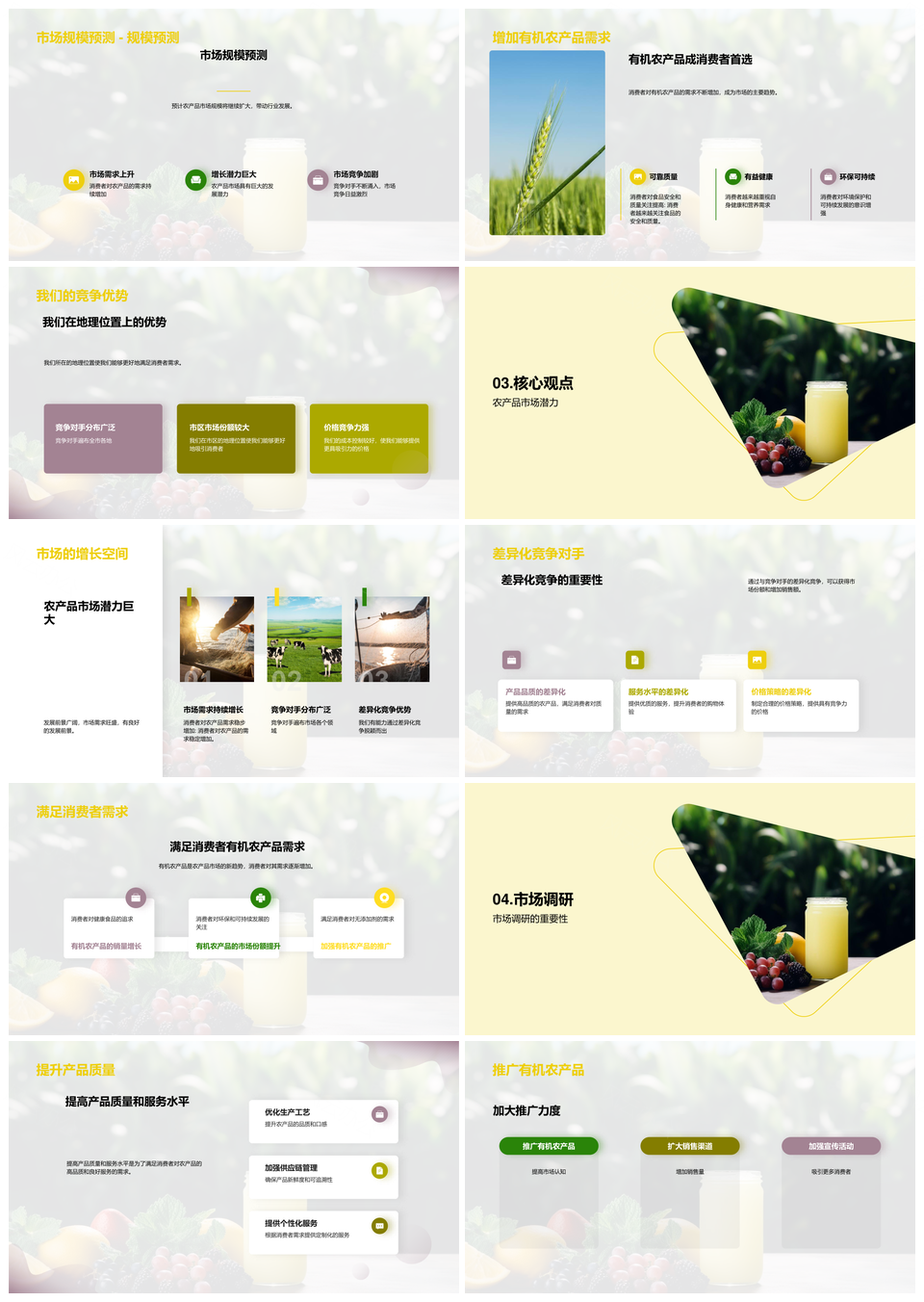 这是一张农产品市场趋势与有机蔬菜竞争消费调研PPT模板,包含农产品市场、趋势、有机蔬菜、竞争、消费调研等主题内容,也可用作农产品市场趋势有机蔬菜、市场趋势有机蔬菜竞争、有机蔬菜竞争消费调研、农产品市场趋势调研、市场趋势竞争消费、有机蔬菜消费调研、农产品竞争消费调研、农产品市场有机蔬菜、市场有机蔬菜竞争、有机蔬菜竞争消费、趋势与有机蔬菜竞争、农产品消费调研、市场趋势消费、有机蔬菜调研、竞争消费调研等PPT场景使用。 风云办公提供的农产品市场趋势与有机蔬菜竞争消费调研PPT模板,下载格式为pptx,一共19页,作品中文字及图均可以修改和编辑,图片更改请在作品中右键图片并更换,文字修改请直接点击文字进行修改。