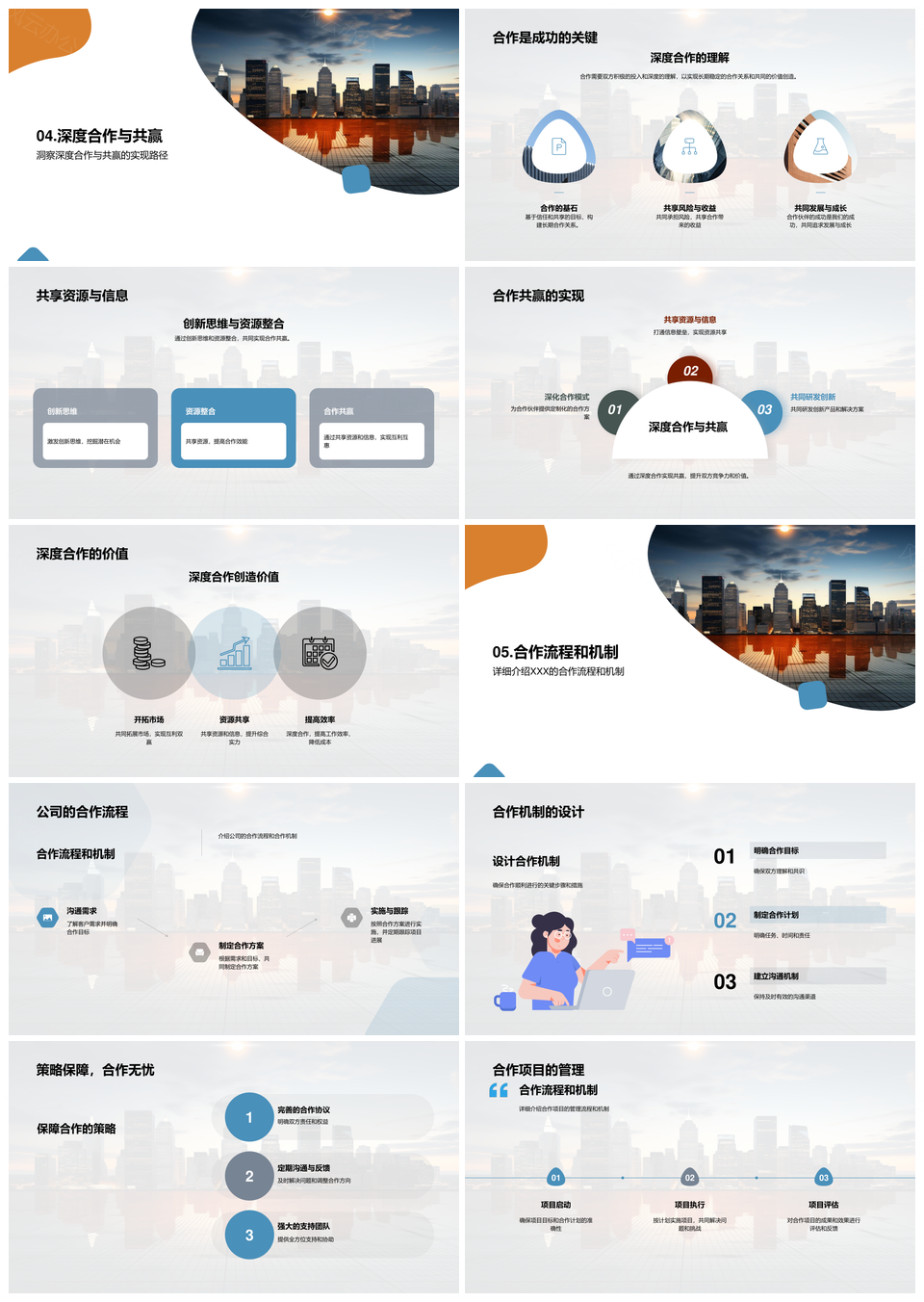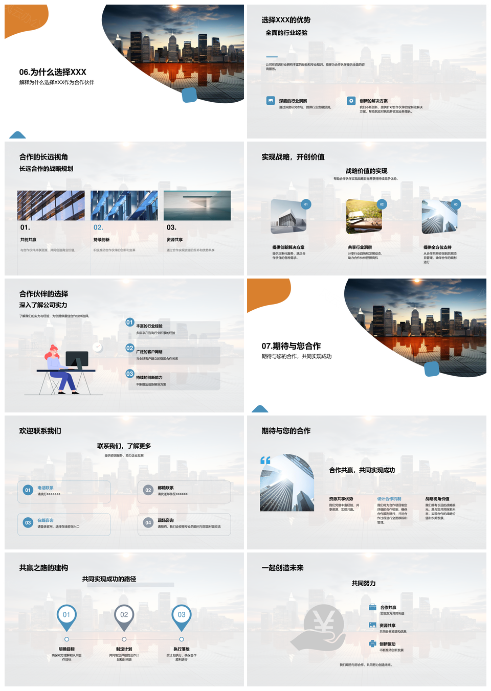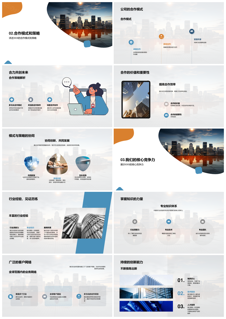 这款商务科技主题PPT模板以白、浅蓝、天蓝为基底,搭配活力橙黄点缀,整体色调兼具专业沉稳与现代活力,视觉层次分明。版面采用极简设计语言,干净线条与低饱和渐变过渡营造理性科技感,立体几何模块强化信息结构化呈现。布局兼顾功能与美学,留白空间强化内容聚焦力,适用于企业战略汇报、智能产品发布会等高专业度场景。字体与图表经过多版调试,保证多设备显示清晰度,辅助动画设计克制实用,避免分散听众注意力,帮助演讲者高效传递核心价值。