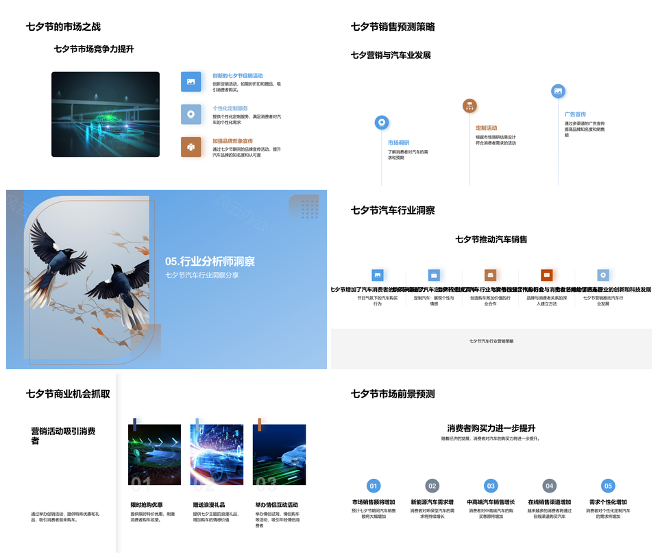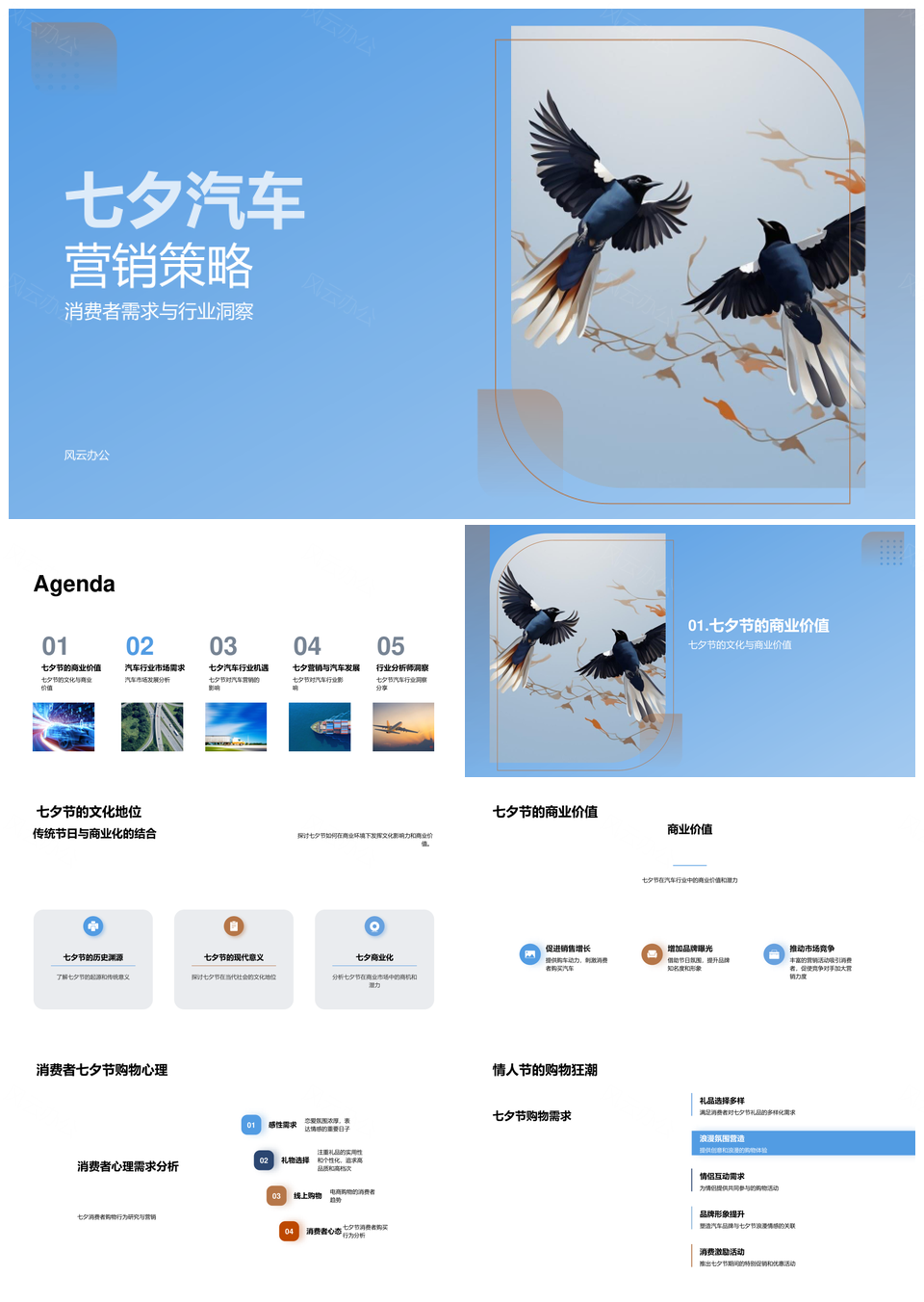 风云办公提供的七夕汽车营销需求洞察与鹊桥机遇PPT模板,下载格式为pptx,一共24页,作品中文字及图均可以修改和编辑,图片更改请在作品中右键图片并更换,文字修改请直接点击文字进行修改。