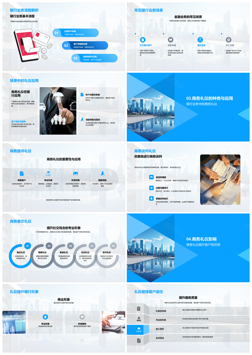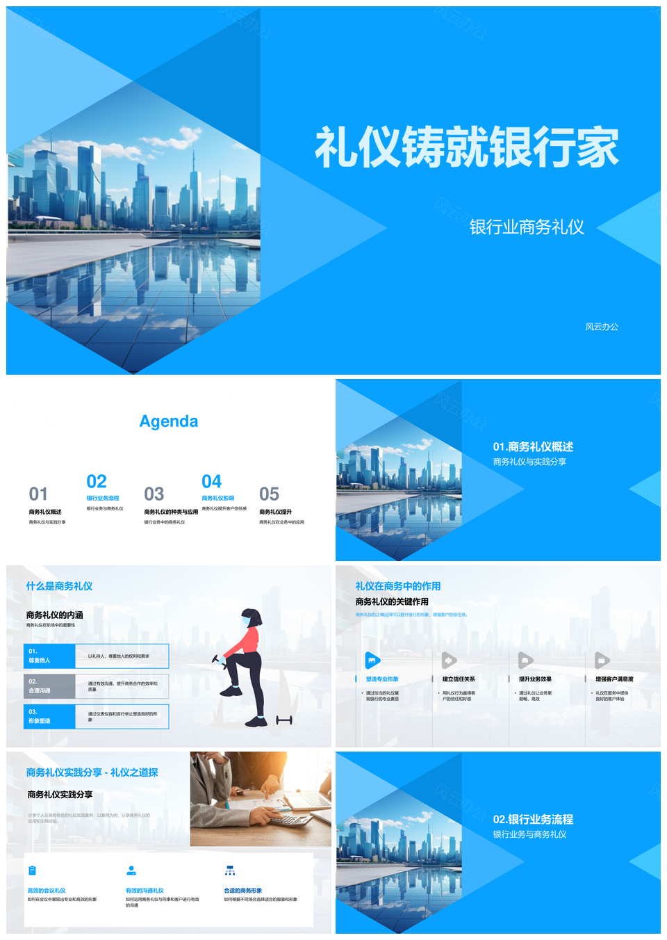 风云办公提供的商务礼仪铸银行业务信任流程PPT模板,下载格式为pptx,一共23页,作品中文字及图均可以修改和编辑,图片更改请在作品中右键图片并更换,文字修改请直接点击文字进行修改。